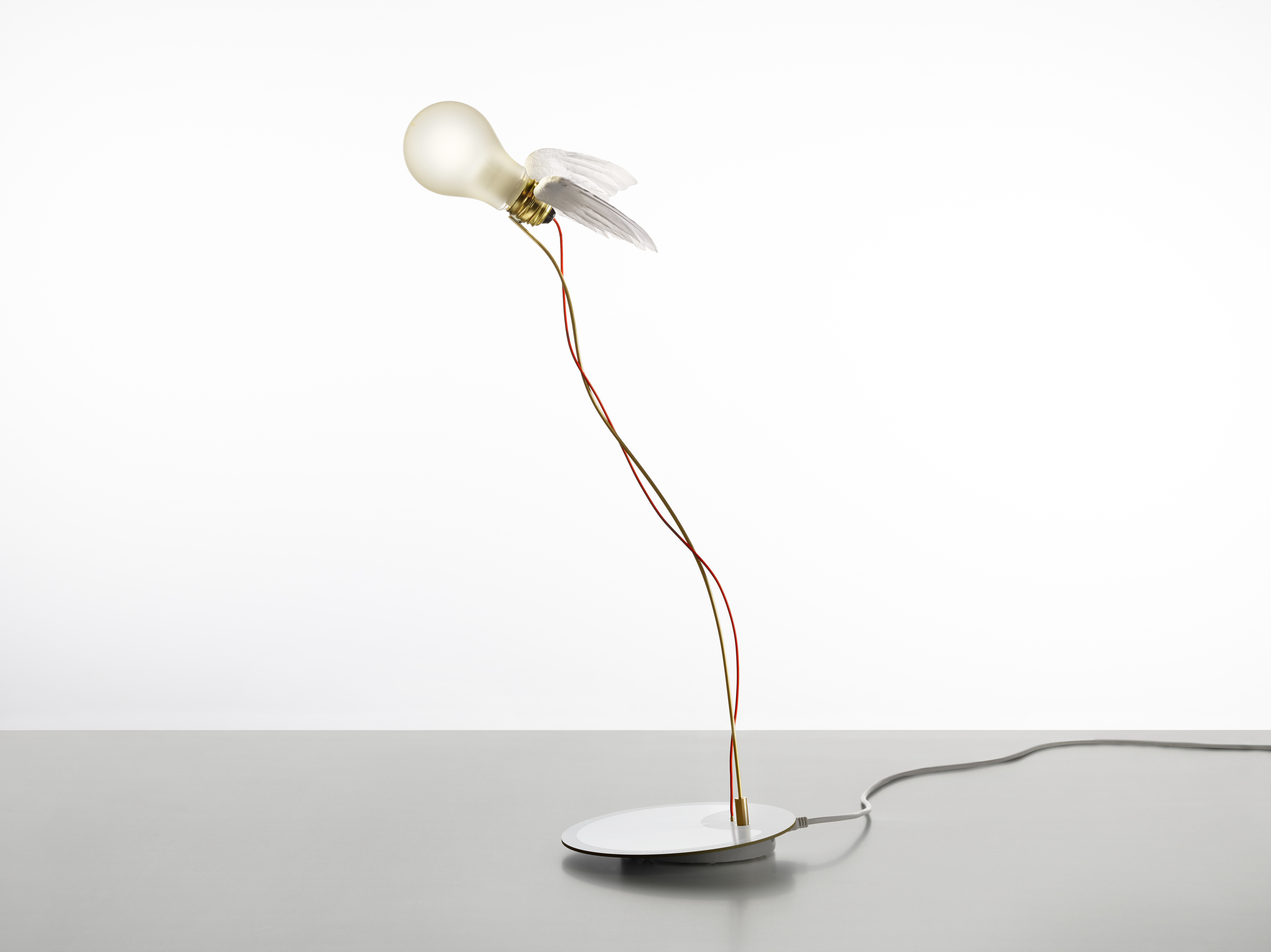 The lamp features handcrafted goose-feather wings attached to an E27 base. It uses a matte bulb powered by a 24-volt secondary voltage. Originally designed for use in train lighting systems until the 1990s, these 24-volt bulbs with standard sockets are now exclusively manufactured for Ingo Maurer GmbH and are compatible only with Lucellino models. A distinctive red cable is soldered directly to the bulb. Note: This lamp is not suitable for use in high-humidity environments.