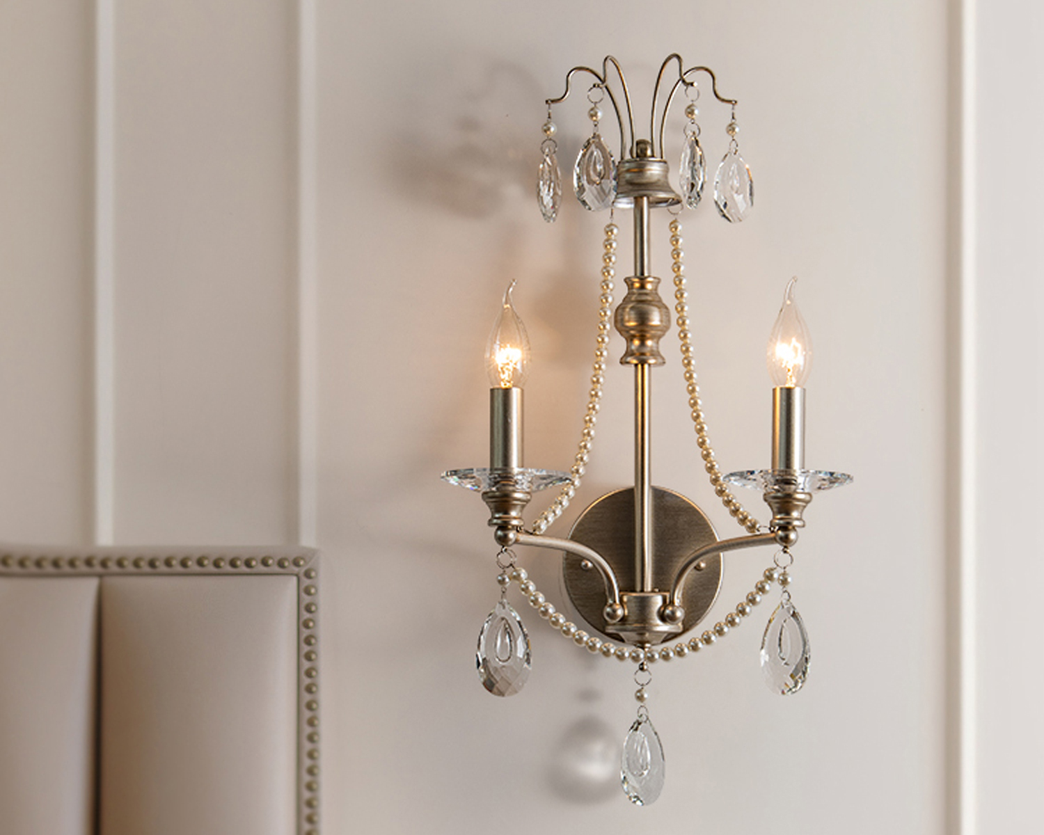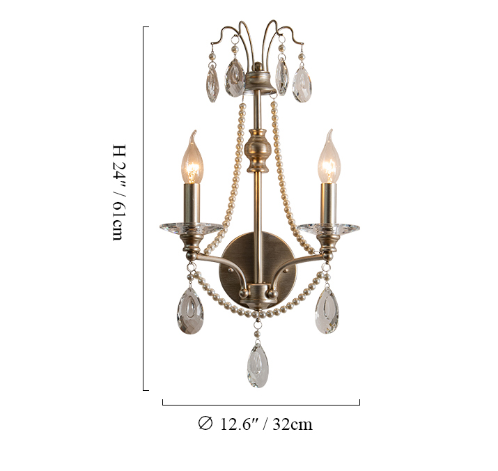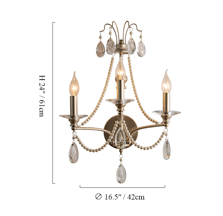 The Versailles Pearl Wall Sconce blends timeless elegance with refined craftsmanship, pairing crystal pendants with delicate pearl strands to create a softly luminous statement piece. Its sculpted iron frame forms a graceful silhouette that echoes the charm of European vintage lighting, while each crystal drop catches the light to cast subtle, shimmering reflections.