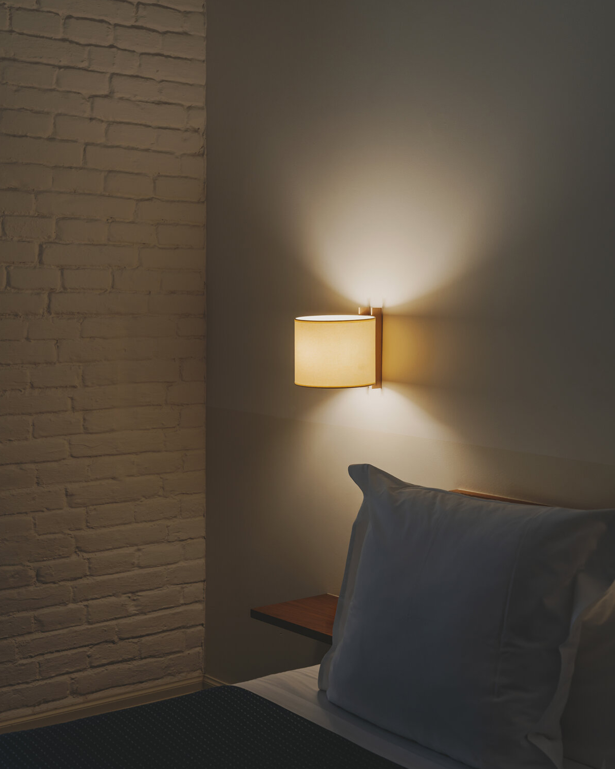 Designed to cast light only upward, these wall lights often block the bulb from direct view below, creating an indirect, ambient effect that highlights ceiling height and softens the atmosphere.