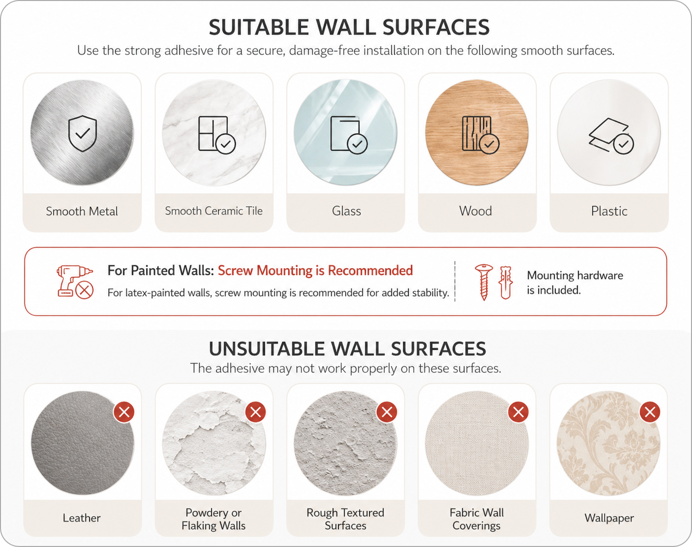 For painted or textured walls, screw mounting is also supported for added stability, with hardware included.