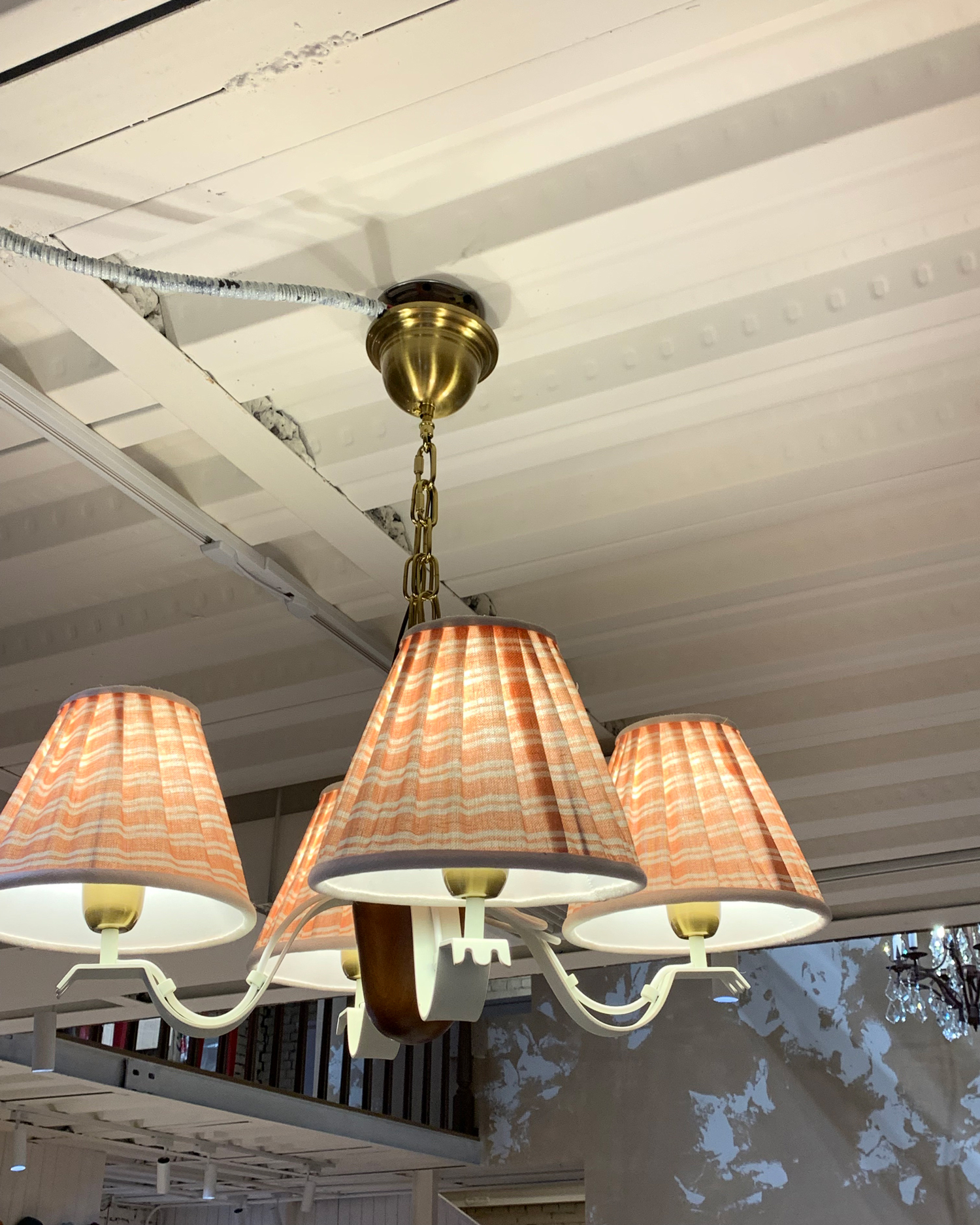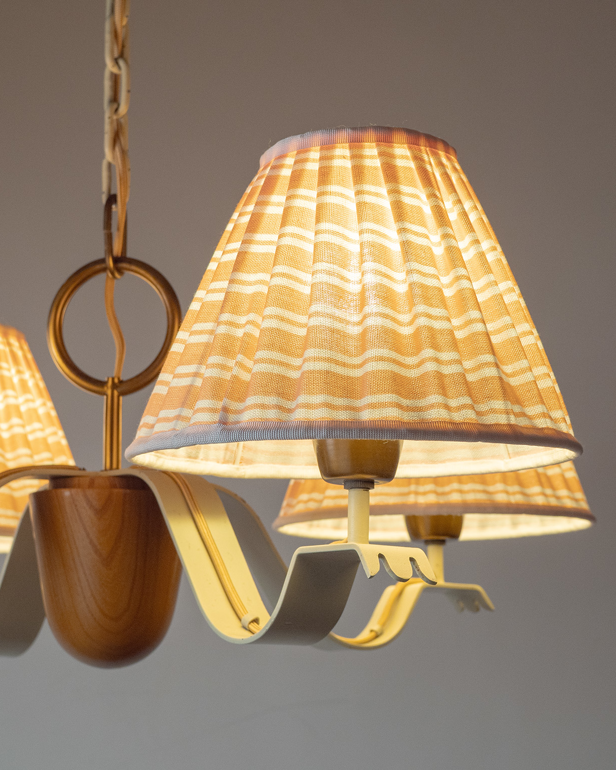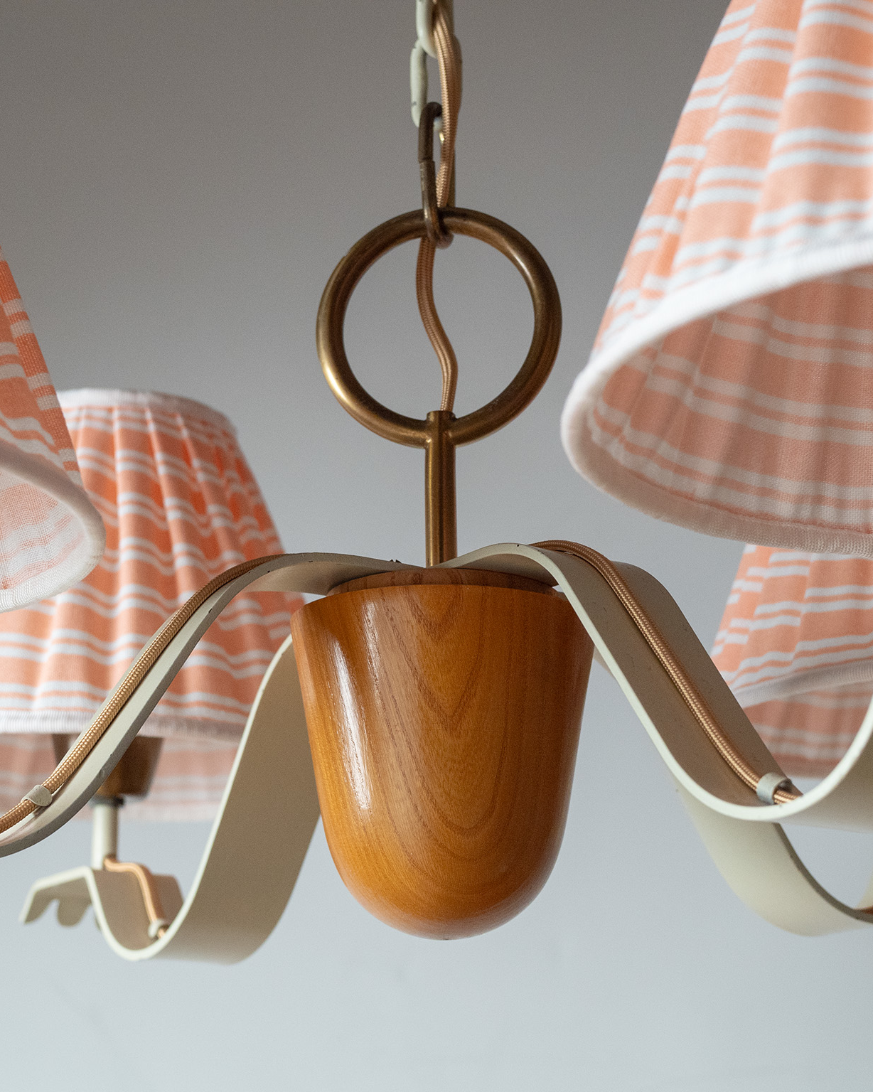 This chandelier follows the same approach. A softly curved iron frame, finished in a light off-white color, holds four pleated fabric shades in a muted coral tone. When the light is on, the fabric spreads the light evenly. As a result, the space feels warm and comfortable rather than brightly lit. Brass details add quiet depth. At the center, solid wood brings balance and a natural contrast to the metal frame.