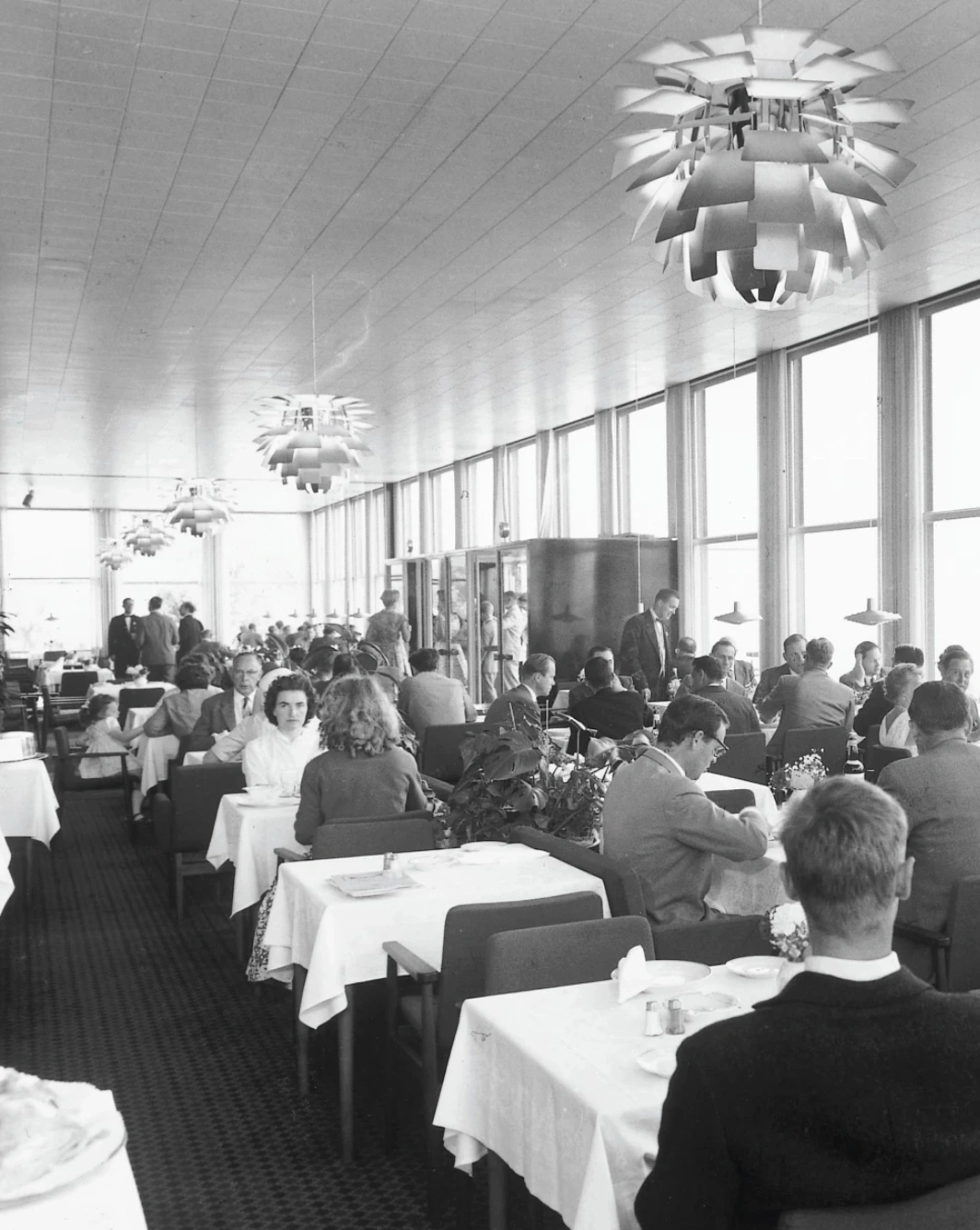 During World War II, Henningsen’s approach to lighting extended beyond aesthetics. For Tivoli Gardens, he developed rotating lamps that directed light horizontally while preventing upward spill, ensuring the park could remain open during wartime blackouts without exposing it to enemy aircraft.