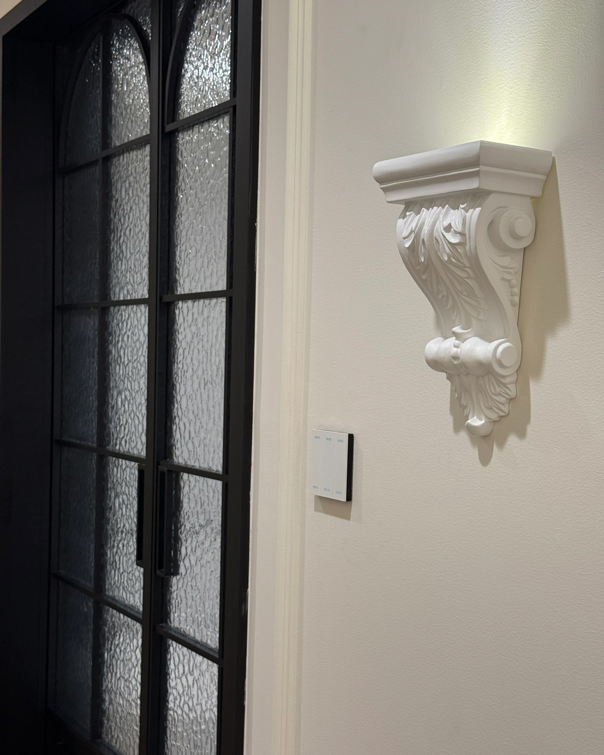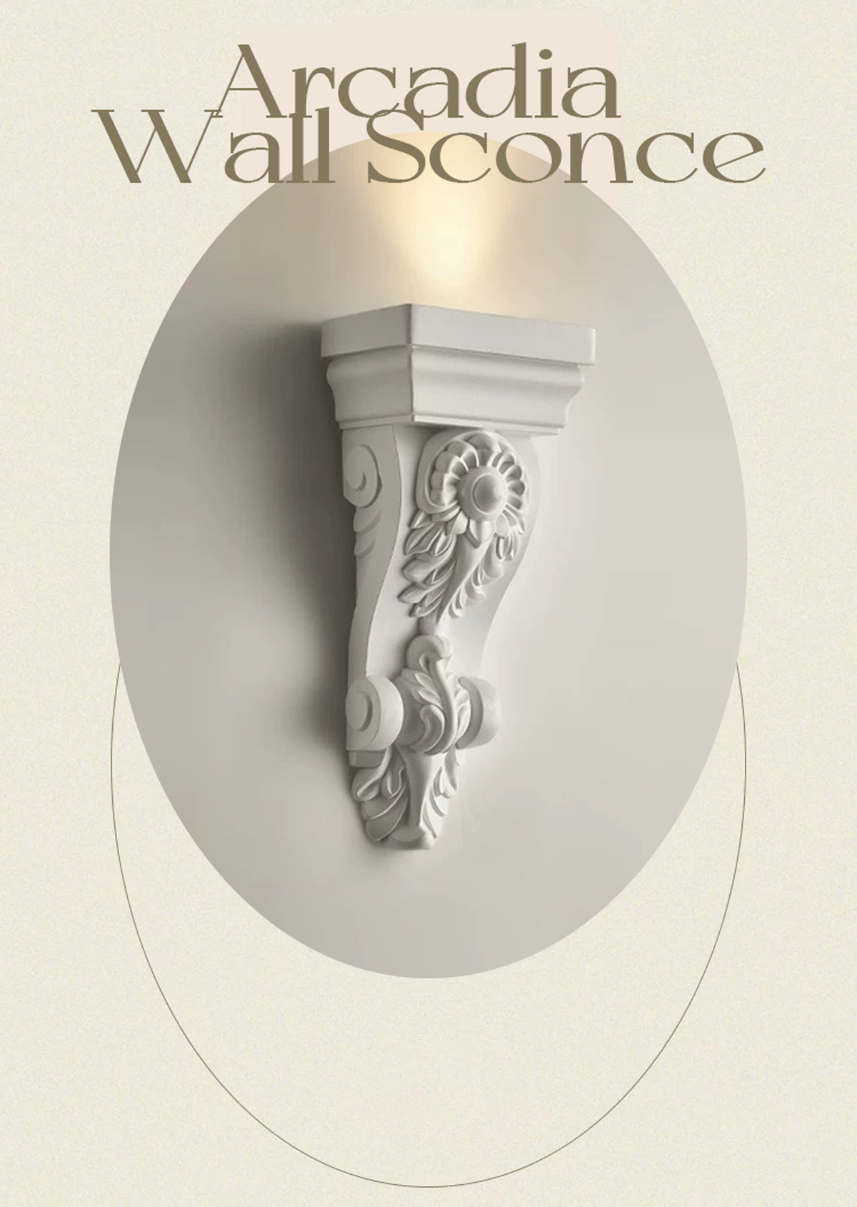 The silhouette of the Arcadia Sconce pays homage to classical antiquity. Drawing inspiration from traditional Greek and Roman corbels, the structure features meticulously carved scrolls and botanical accents that evoke the grandeur of a historic European estate.