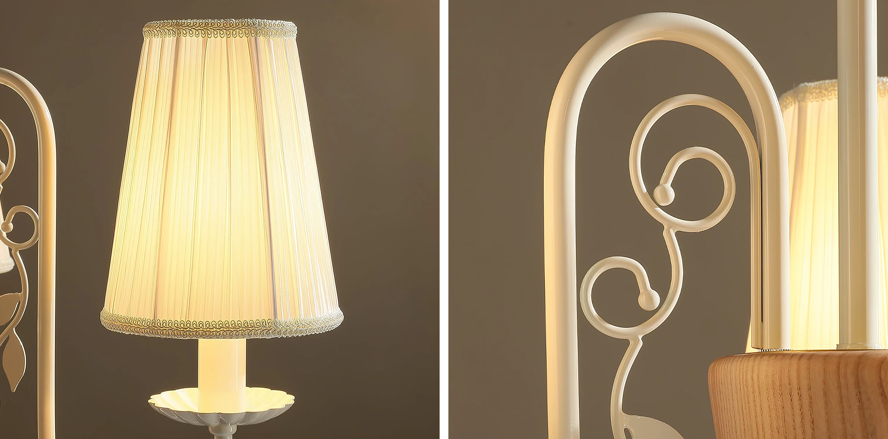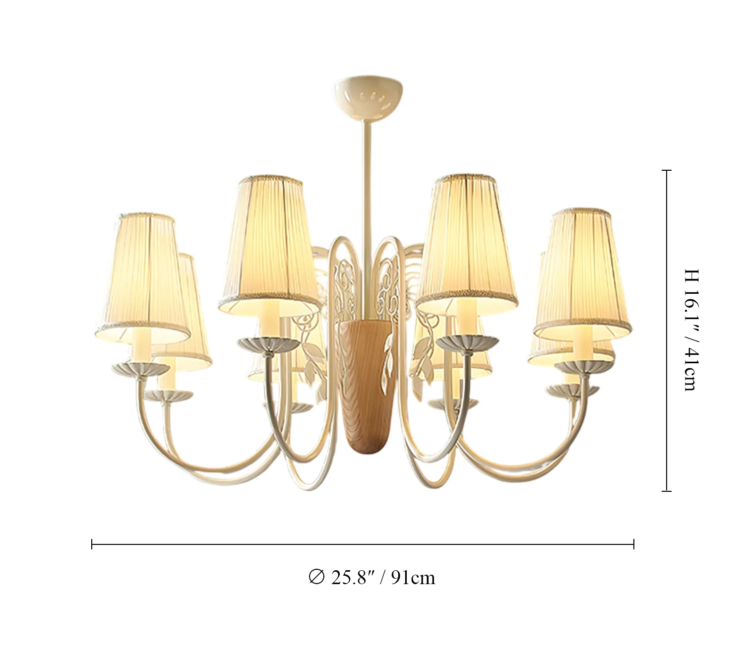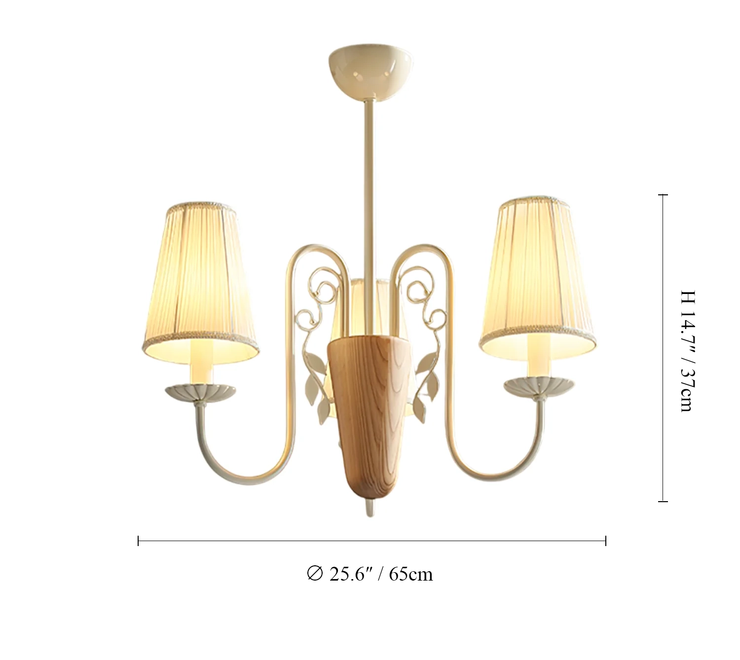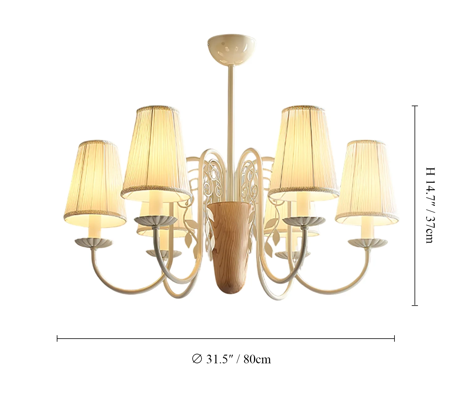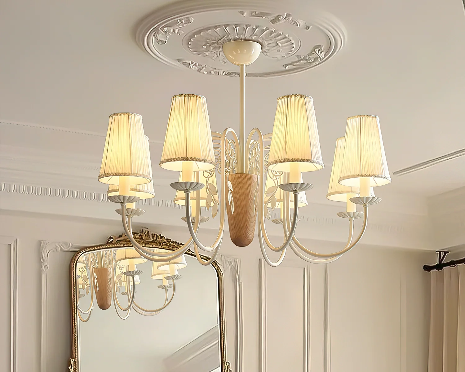 The Evelora Chandelier combines classic elegance with subtle natural charm. Its gently pleated fabric shades sit gracefully atop curved white arms, while a central wooden detail introduces warmth and balance. The soft glow filtering through the shades creates a welcoming ambiance, making it an ideal centerpiece for dining rooms, bedrooms, or any space that values timeless sophistication.