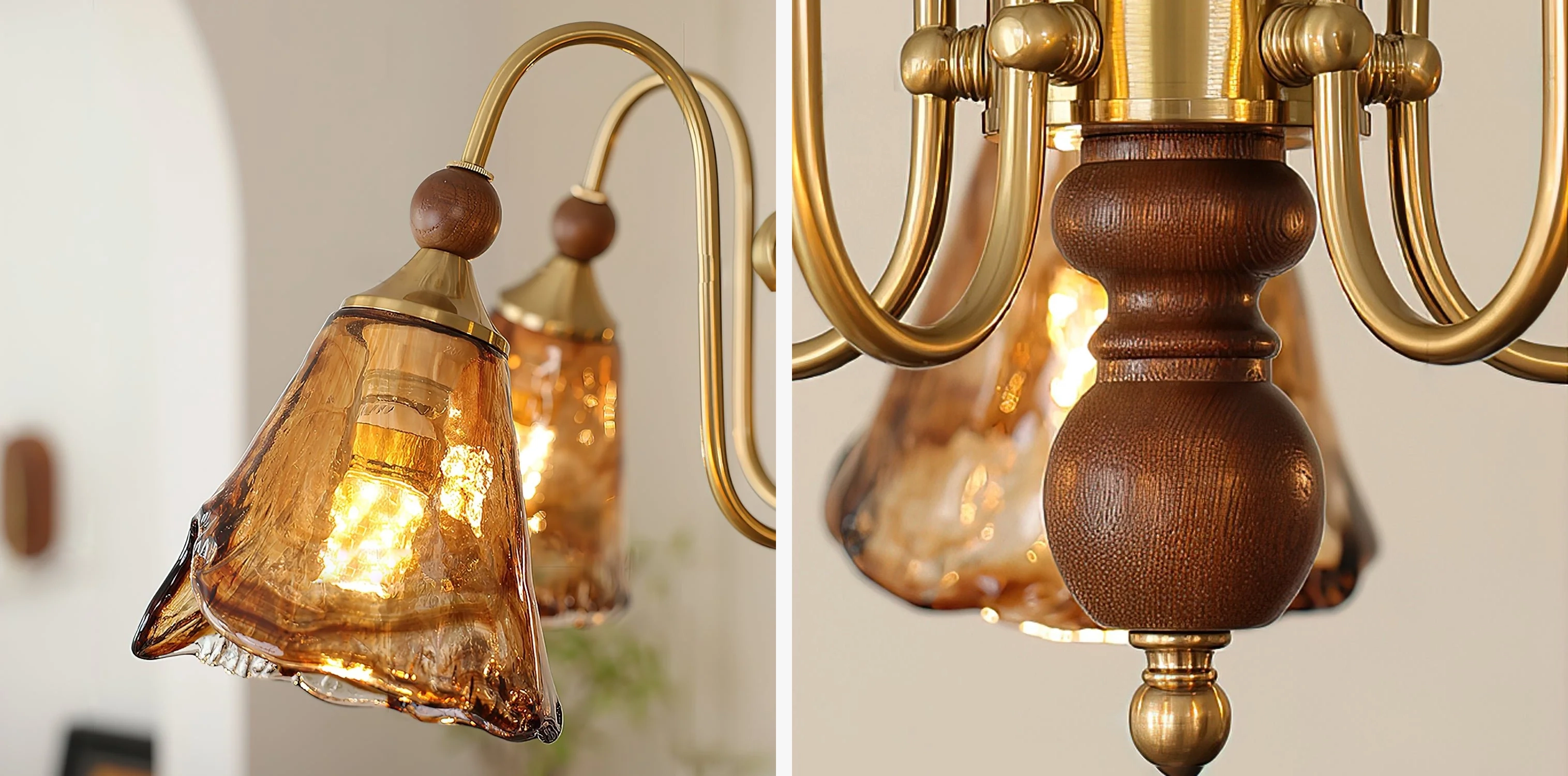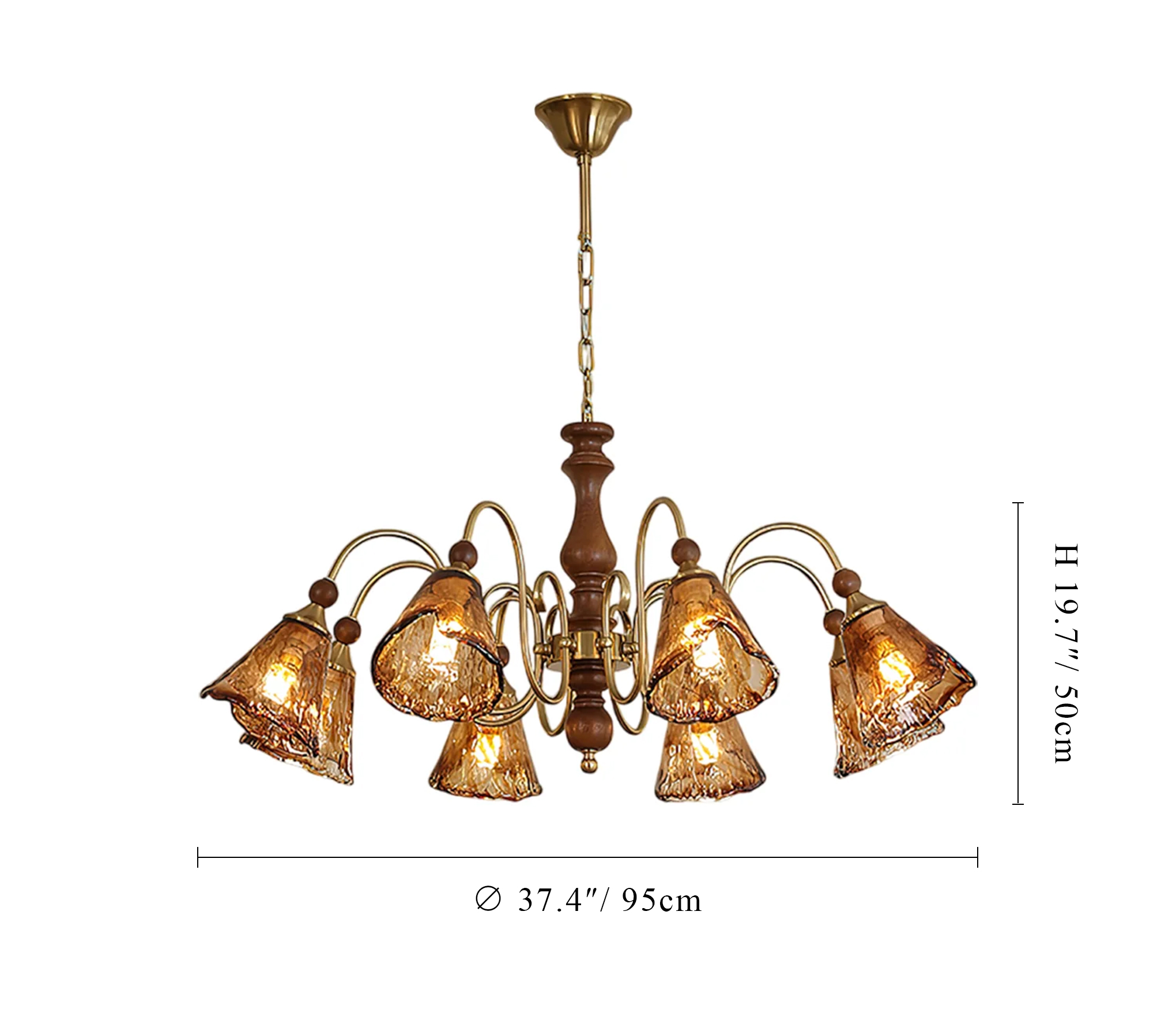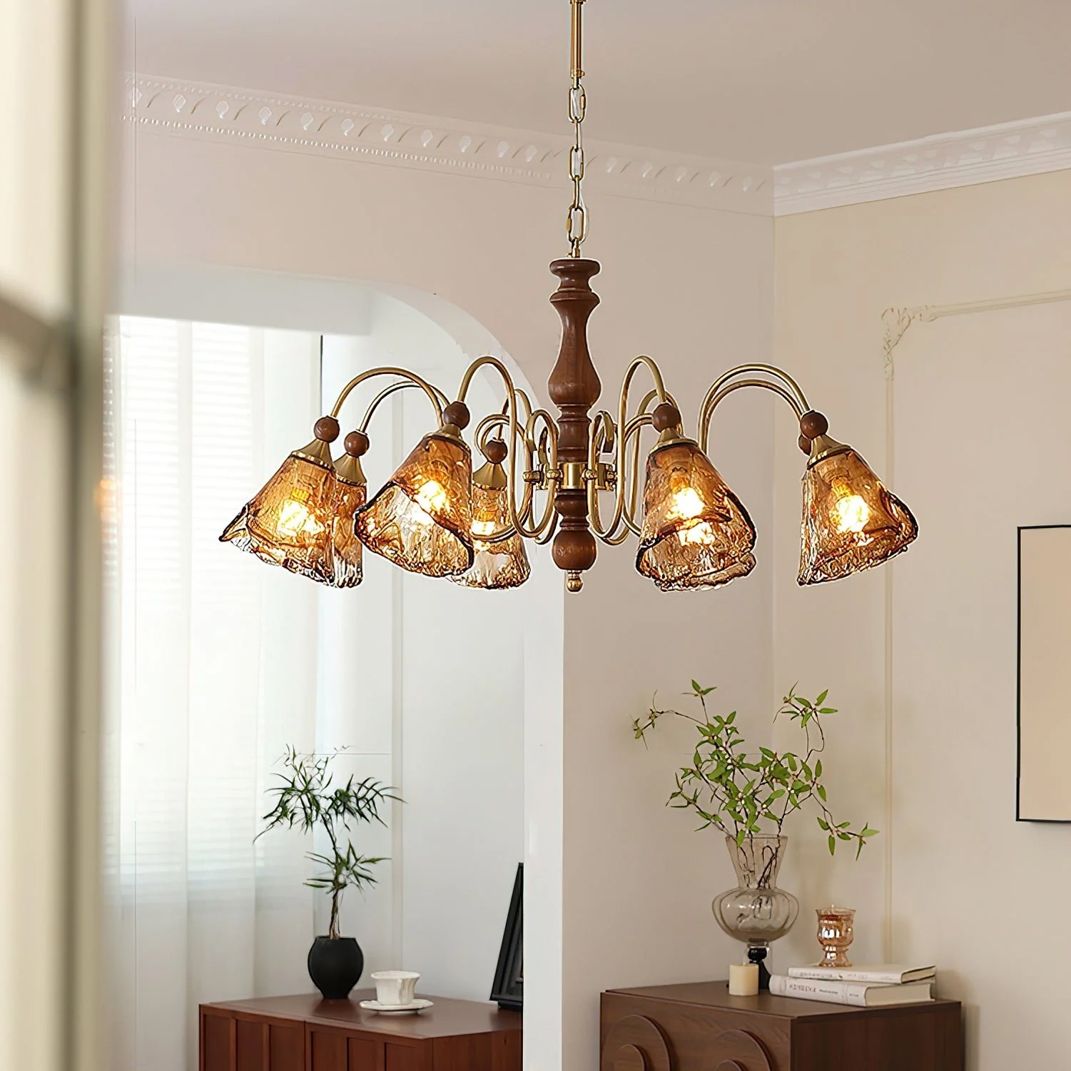 The Florenzia Chandelier takes its inspiration from blossoming flowers, featuring hand-crafted amber glass shades that echo the softness of petals in full bloom. Each shade diffuses a gentle, golden light, while the elegantly curved brass arms and wooden center column enrich the design with warmth and texture. Ideal for dining rooms, living spaces, or entryways, this chandelier introduces a sense of vintage artistry and natural grace. A true statement piece, it embodies craftsmanship, inviting glow, and timeless elegance.