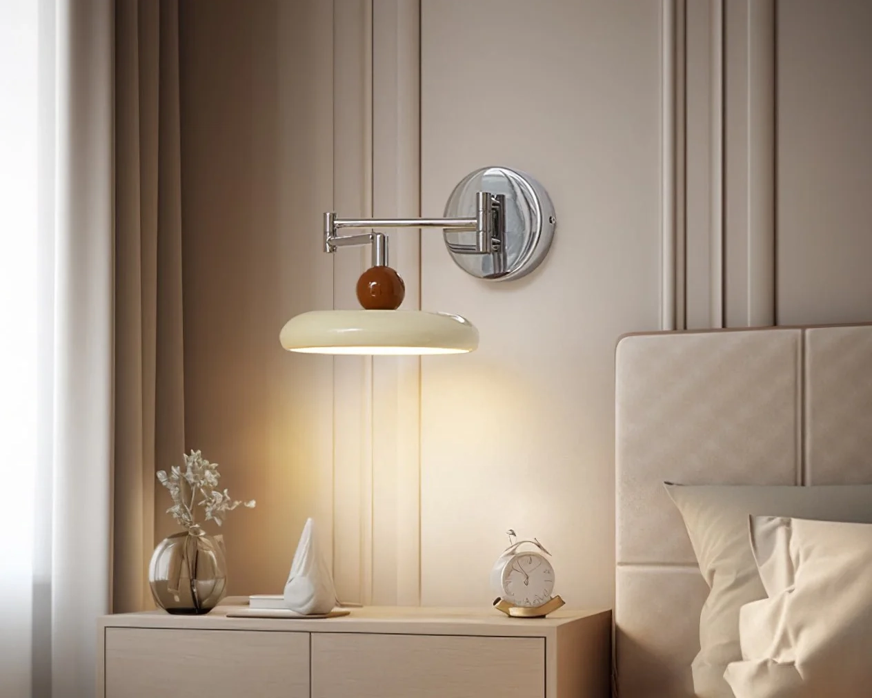 Discover the Lola Swing Arm Wall Lamp — a refined addition to any home seeking a blend of elegance and modern style. Featuring a distinctive round disc design and a sophisticated finish, it casts a warm, inviting glow that effortlessly brightens your space. With its sleek, minimalist form, this versatile wall lamp brings a contemporary touch to your interior décor.