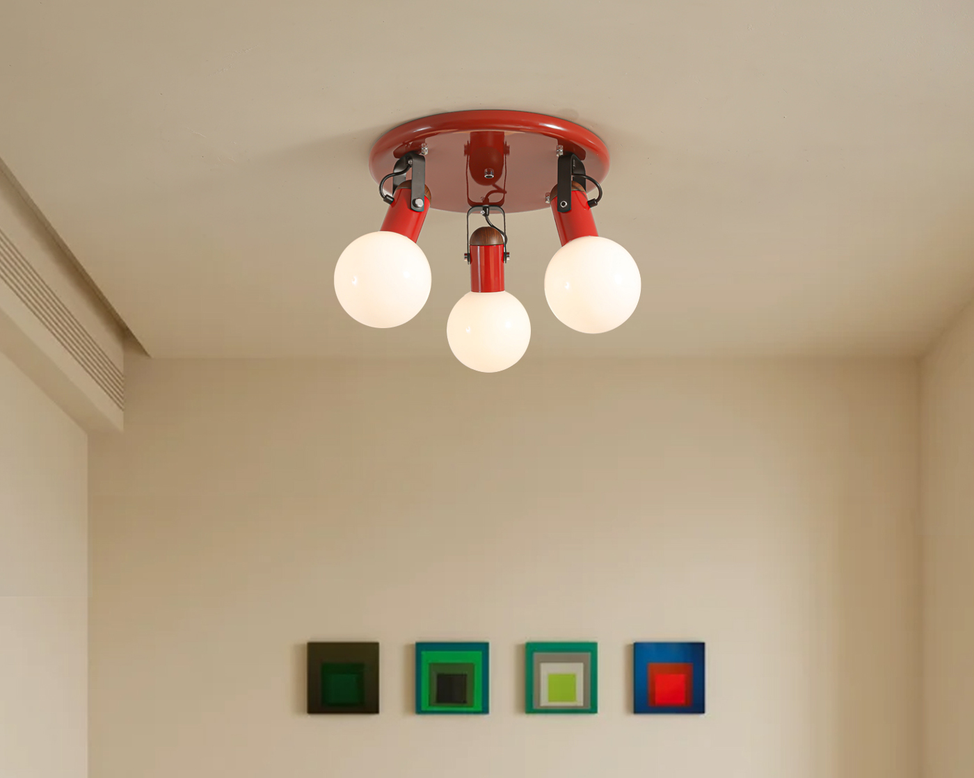 Finished in a warm red tone, the metal body brings a subtle accent to the space, while the diffused light provides a comfortable glow ideal for bedrooms and living areas. Compact in profile, it works especially well in rooms with lower ceilings without feeling visually heavy.