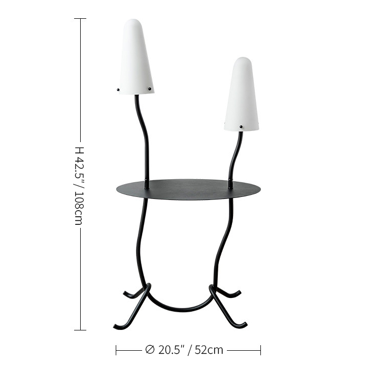 Inspired by the soft conical form of mushrooms in nature, this Twin Mushroom Side Table Floor Lamp brings together lighting and function in a sculptural silhouette. Its dual frosted glass shades diffuse the light gently, creating a warm and even glow that feels calm and inviting.