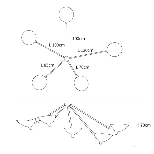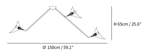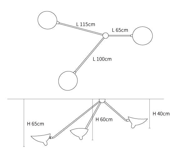 The Three Arm Ceiling Lamp (1958) is a suspended interpretation of his original Three Arm Floor Lamp and maintains the dynamic, sculptural aesthetic of the original. All of his lighting solutions share the designer's signature features: the way the arms are attached to the diffuser, the washer and six-sided screw hardware, the form of the reflector, and the delicate lines of the steel tubes. Bulb (not included): 3*18W/E27. Made in China.
