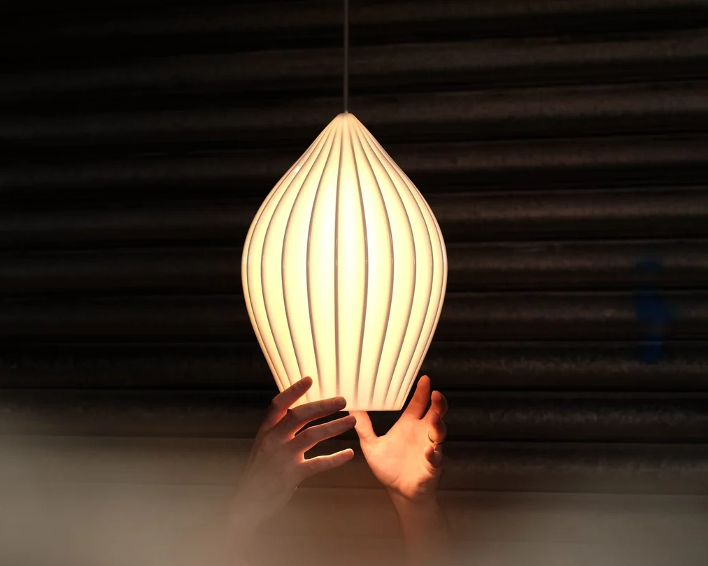 This pendant light is a refined statement piece, featuring a bone china shade expertly shaped into elegant, organic forms. When illuminated, it casts striking contrasts of light and shadow, adding depth and drama to any space. The soft gray cotton braided cord enhances its delicate beauty, lending a subtle, sophisticated charm.