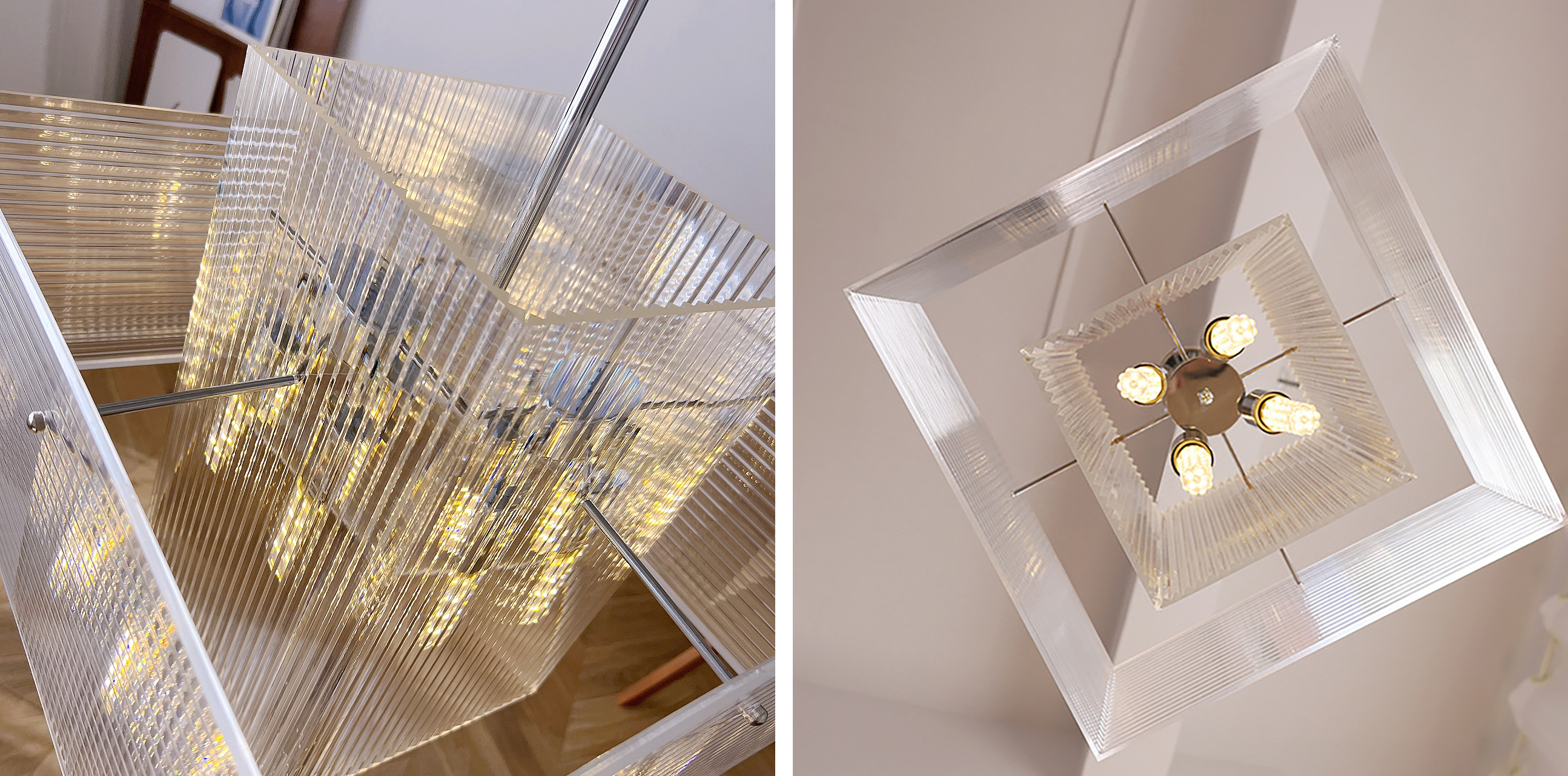 The Ripple Square Pendant Lamp features layered acrylic panels with delicate horizontal textures that capture and reflect light like ripples across water.