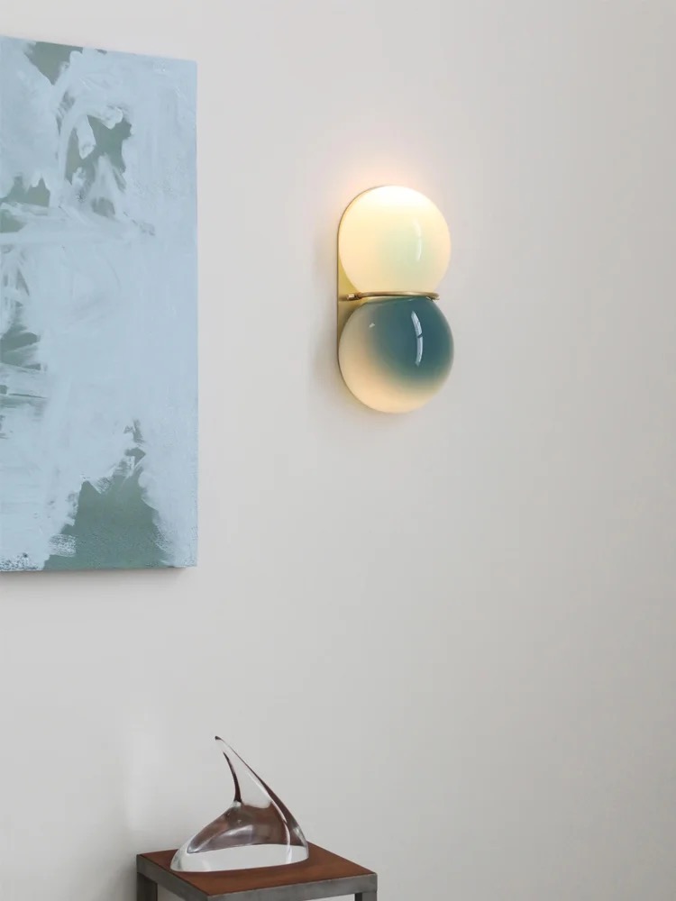 Le sconce Twin 1.0 présente un diffuseur bicolore en verre soufflé à la main tchèque, composé de deux éléments en verre sphériques plats qui fusionnent lorsqu'ils sont chauffés sur le tuyau de soufflage. Le verre est maintenu par une bande en laiton reliant les deux sphères et monté sur un couvercle supérieur en laiton massif. Chaque sphère est éclairée par une ampoule interne, avec une ampoule par sphère.
