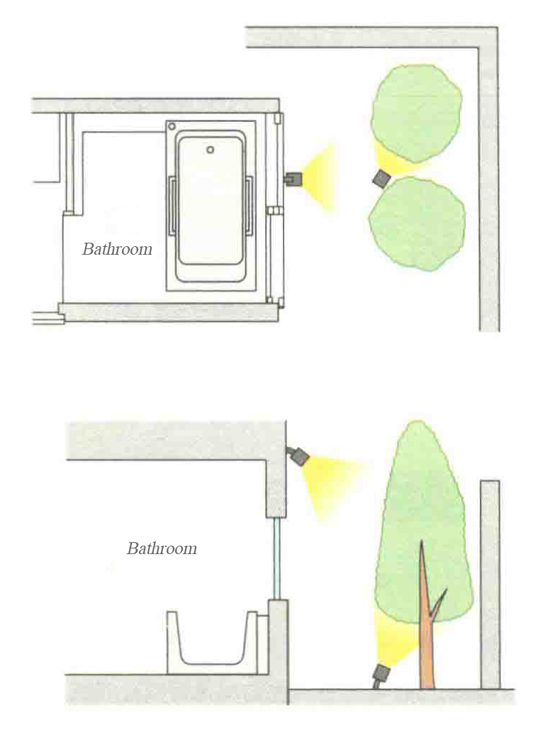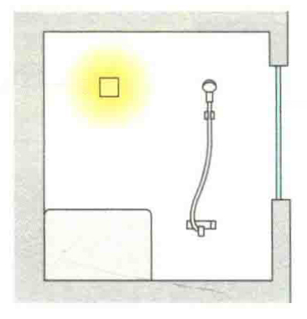If lighting fixtures are installed on the bathtub side (opposite the window), the user’s silhouette may appear on the frosted glass of the window. To prevent this, fixtures should be placed as shown in the illustration. In addition, when a person is soaking in the bathtub, the fixtures must be positioned outside their direct line of sight.