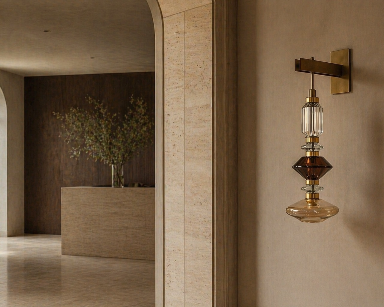 Clear and amber elements create a soft interplay of light, adding depth without visual weight.