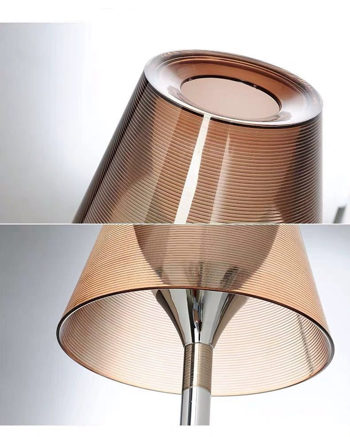 The lamp is available with an acrylic shade in clear, smoke grey, or amber, offering different degrees of transparency and warmth. A fabric shade option is also available, providing a softer, more ambient expression. Finished with a clean metal structure, the design remains elegant and restrained, suitable for both residential and hospitality interiors.