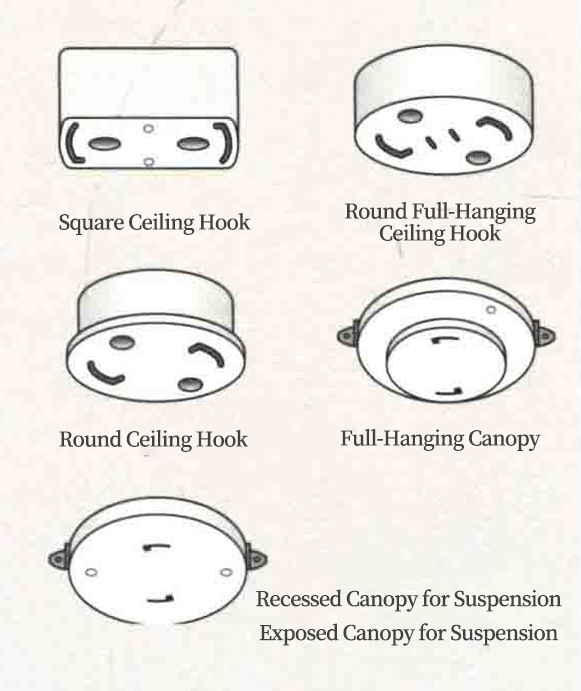 - Most will be mounted with ceiling hooks. It is important to check the compatibility of the ceiling hooks with the bottom of the luminaire against the manufacturer's catalog.