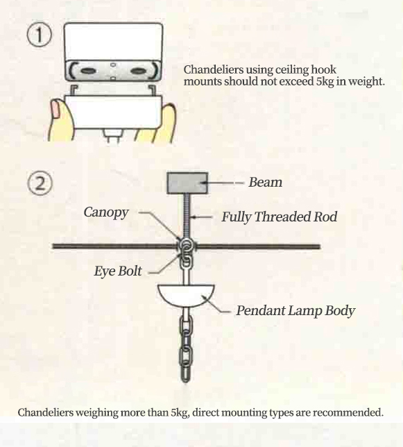 - When ceiling hooks are used, attention must be paid to the weight of the lamp.