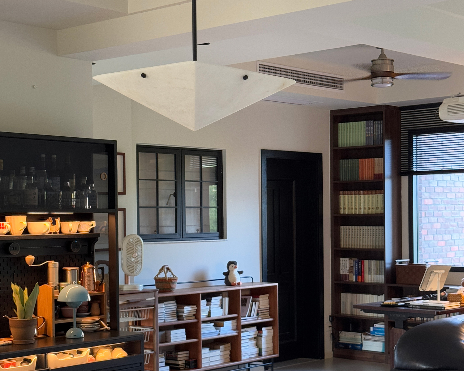 A study in balance and geometry, the Apex Pendant Light features a sculptural alabaster shade shaped into an inverted pyramid. When illuminated, the stone reveals delicate natural veining, diffusing a soft, ambient glow that lends quiet sophistication to dining rooms, entryways, or living spaces.