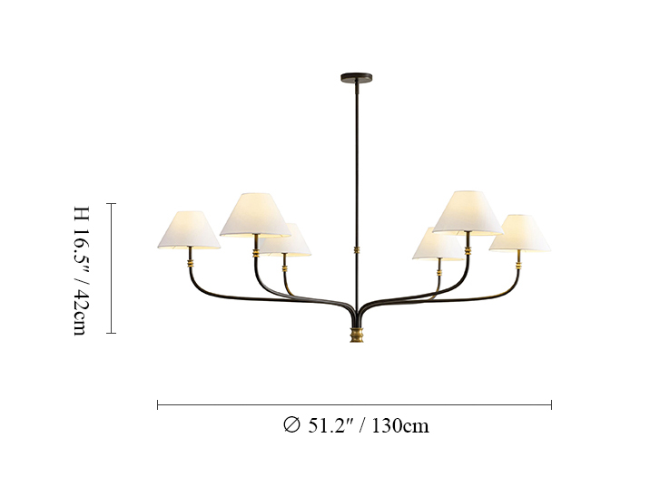 With its slender iron arms and delicate fabric shades, the piece balances geometry and softness in perfect harmony. Subtle brass accents lend a touch of timeless warmth, while the six gently flared shades diffuse light into a calm, inviting glow.