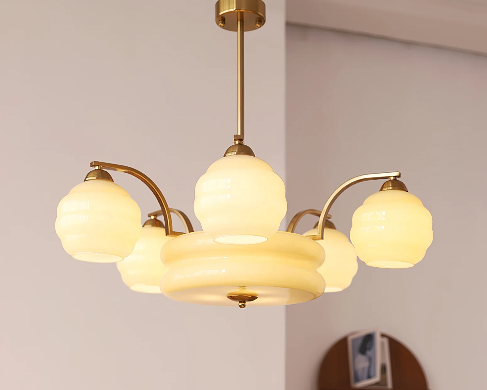 Elegant and timeless, this Art Deco–inspired chandelier brings vintage sophistication to both contemporary and classic interiors. Its sculptural white glass shades—gracefully contoured and softly glowing—evoke the charm of the 1920s while casting a warm, inviting light. Available in gold or chrome finishes, the fixture features a meticulously crafted suspension that highlights the enduring beauty of industrial vintage design.