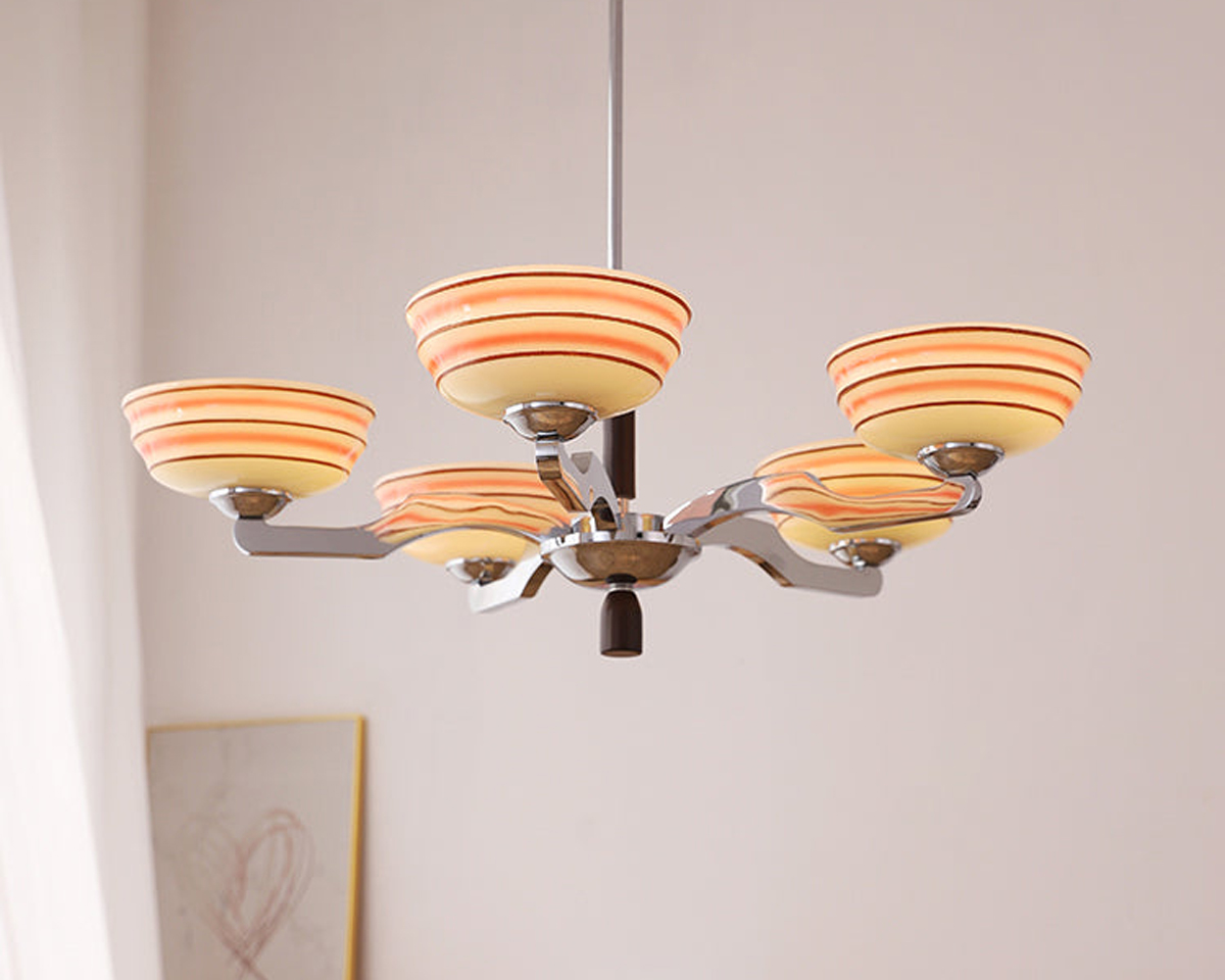 Soft ripples of light meet delicate color transitions, the Auralis Chandelier captures the poetry of glowing glass and warm metal. Each shade reveals gentle layers of amber and rose, echoing the rhythm of light in motion.