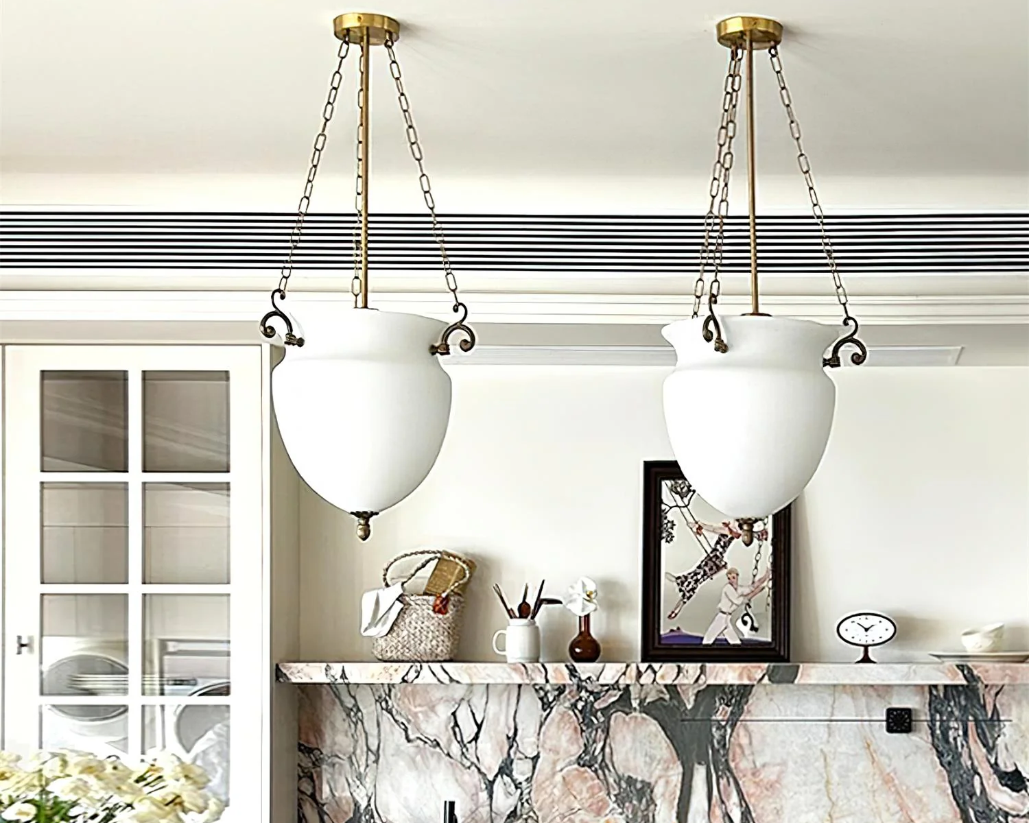 The Aurelia Glass Pendant Light brings a quiet, sculptural elegance to any interior. Made from hand-finished opal glass paired with aged brass details, its urn-shaped silhouette diffuses a warm, gentle glow that feels timeless in both modern and vintage-inspired spaces.