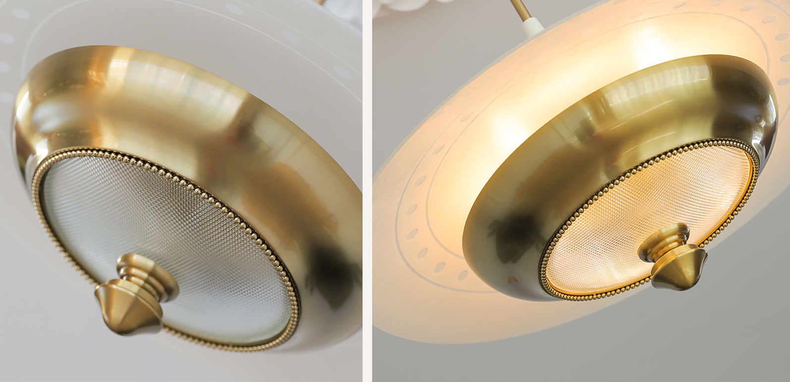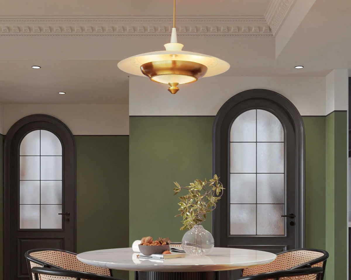 Inspired by European lighting design of the 1940s, the Aurelien Pendant Lamp is defined by its layered glass construction and balanced proportions. A broad frosted glass disc softly spreads light downward, while the textured inner glass gently filters glare, creating a warm and composed glow.