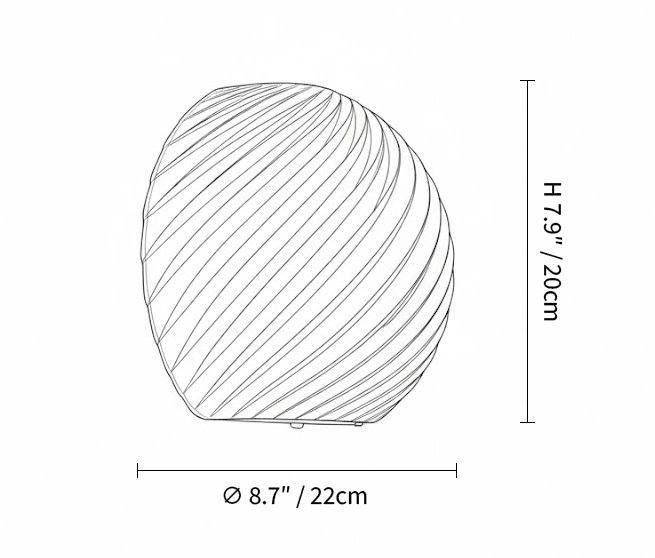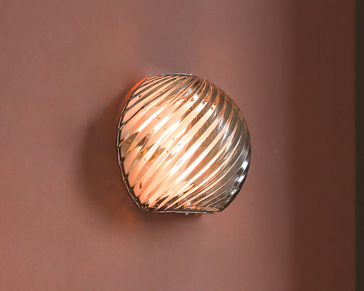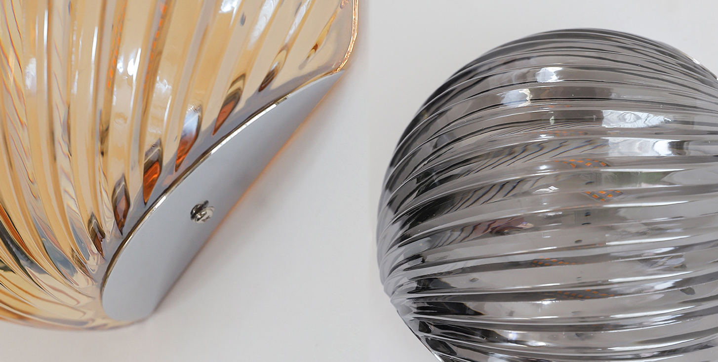 The spiraled glass surface refracts light with subtle variation, creating a quiet interplay of glow and shadow. Paired with a refined iron structure, the piece balances texture and restraint.
