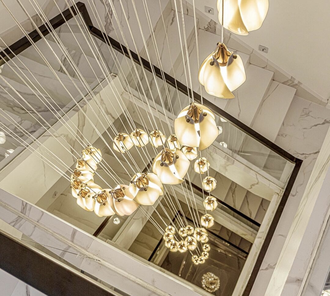 Bloom is a lighting range that draws inspiration from the initial blossoms of Spring. The stylized Bloom buds are illuminated from within, casting a gentle glow through their translucent porcelain petals, which come in a soft matte or glossy finish. The buds are elegantly accentuated with gold-plated fixtures and adorned with fine silk braided cables, adding a timeless sense of opulence to the installations.