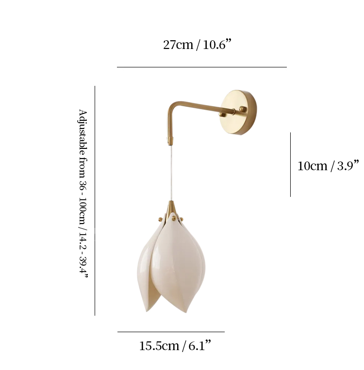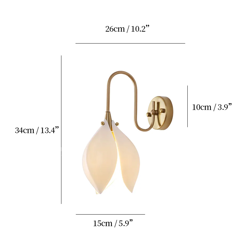 Inspired by the graceful form of magnolia blossoms, this wall lamp brings a touch of organic elegance to any space. Crafted from iron and finished with a sleek electroplated coating, the fixture boasts a smooth, lustrous surface that’s both corrosion- and rust-resistant. The creamy texture of the exterior pairs with high light transmittance to create a soft, shadow-free glow that’s gentle on the eyes—perfect for reading, relaxing, or simply setting a tranquil mood. When lit at night, it evokes the serene ambiance of a forest, as if you could hear the soft whispers of magnolia petals in the glow—bringing a deeply soothing presence to your room.