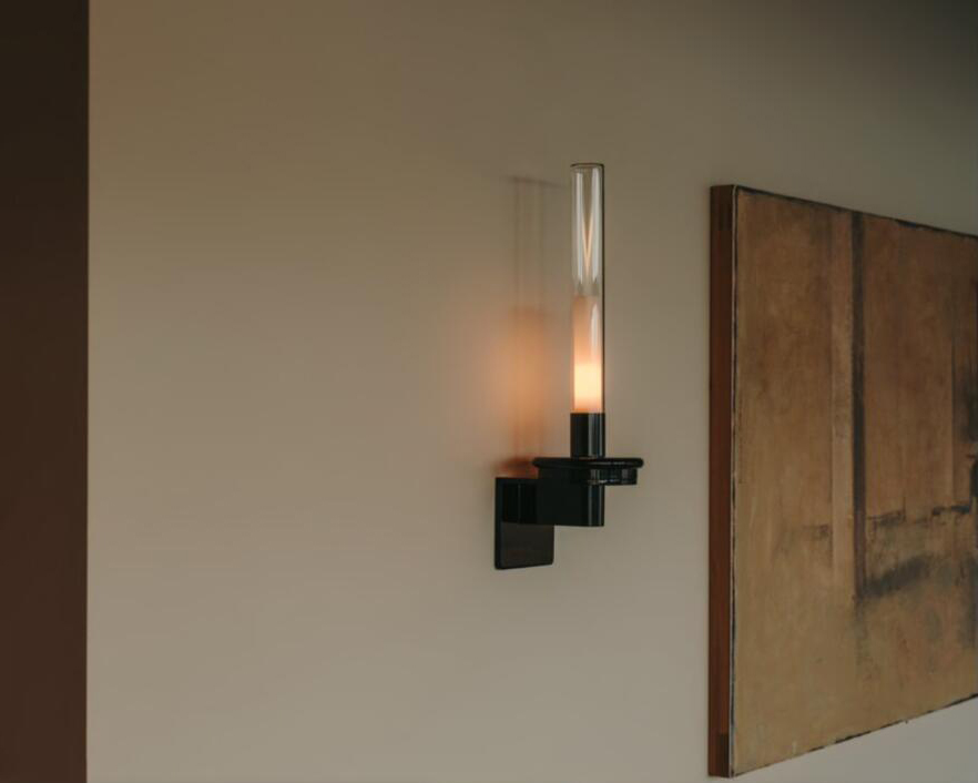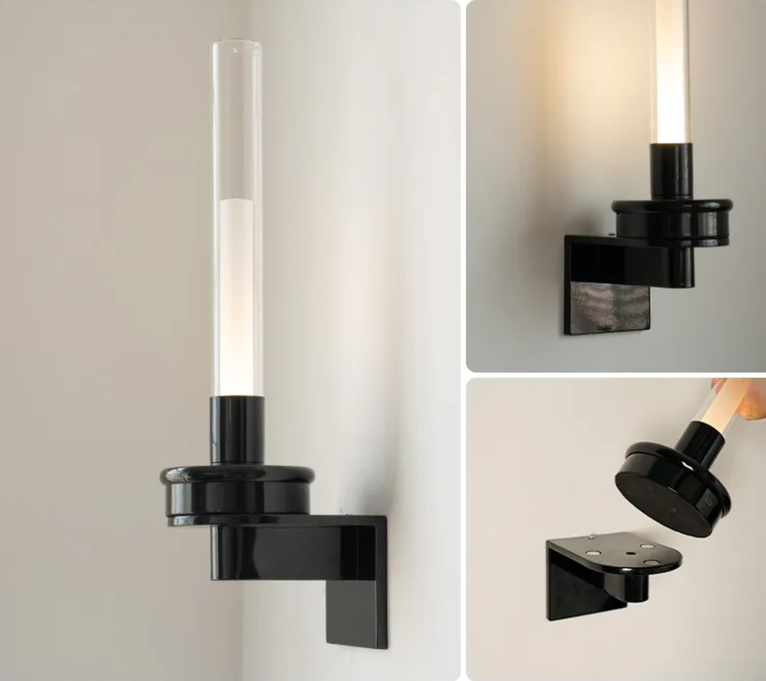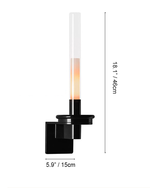 The Candlelight Radiance Wall Sconce features a sleek round metal base finished in glossy black, with a cylindrical glass shade that radiates a comforting, warm light. Inspired by traditional candlelight, this sconce is designed to provide ambient lighting for expansive spaces, corridors, and smaller corners. The light can be activated with a simple touch to the metal base, and it includes two brightness settings for versatile lighting control.