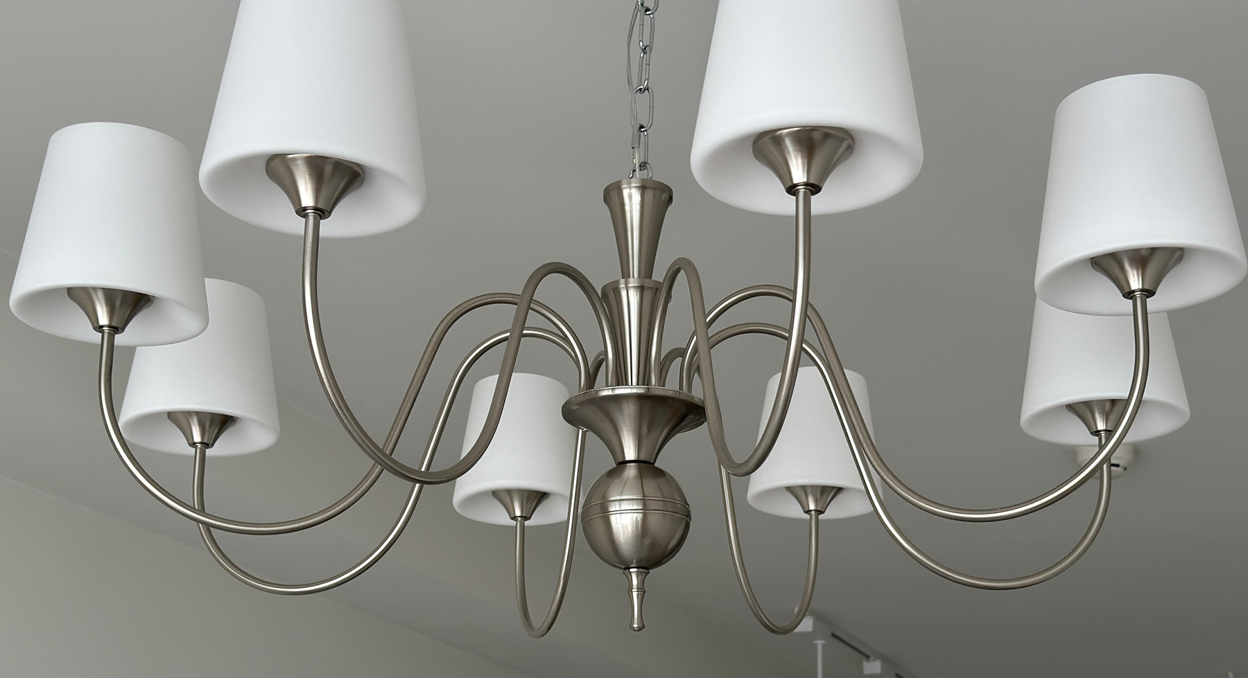 The Canto Chandelier moves with a gentle rhythm. Finished in a soft sand nickel tone, its curved metal arms extend naturally, each supporting a glass shade that filters light into a calm, evening-ready glow.