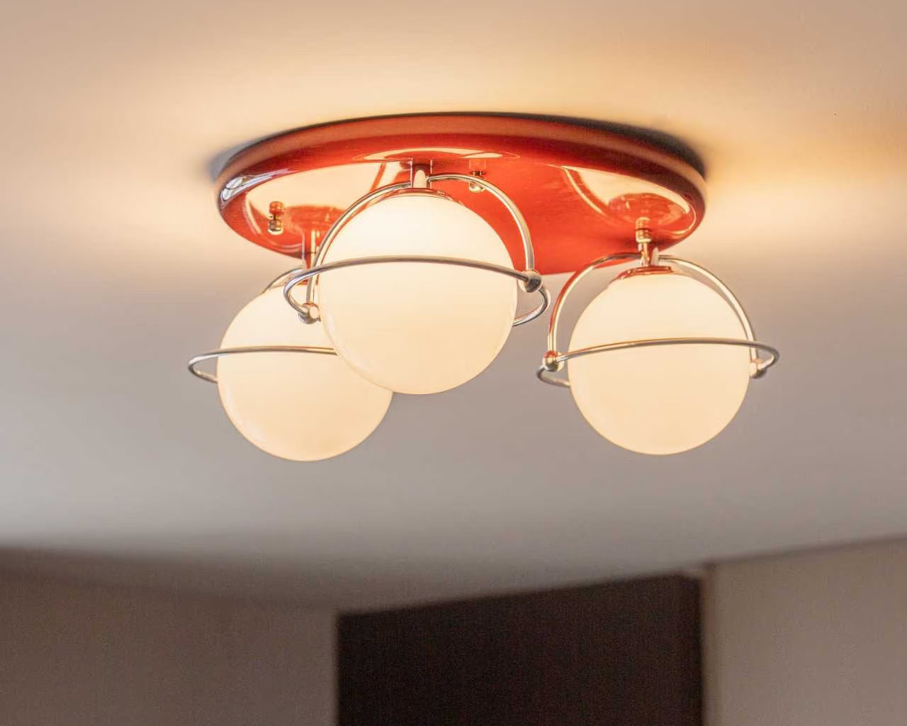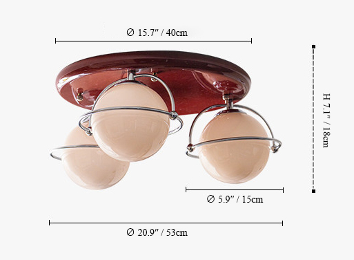 A warm carmine-toned base anchors the design, paired with softly diffused glass spheres that bring a gentle, even glow. The subtle metal rings introduce a light structural contrast, adding just enough definition without interrupting the overall softness.