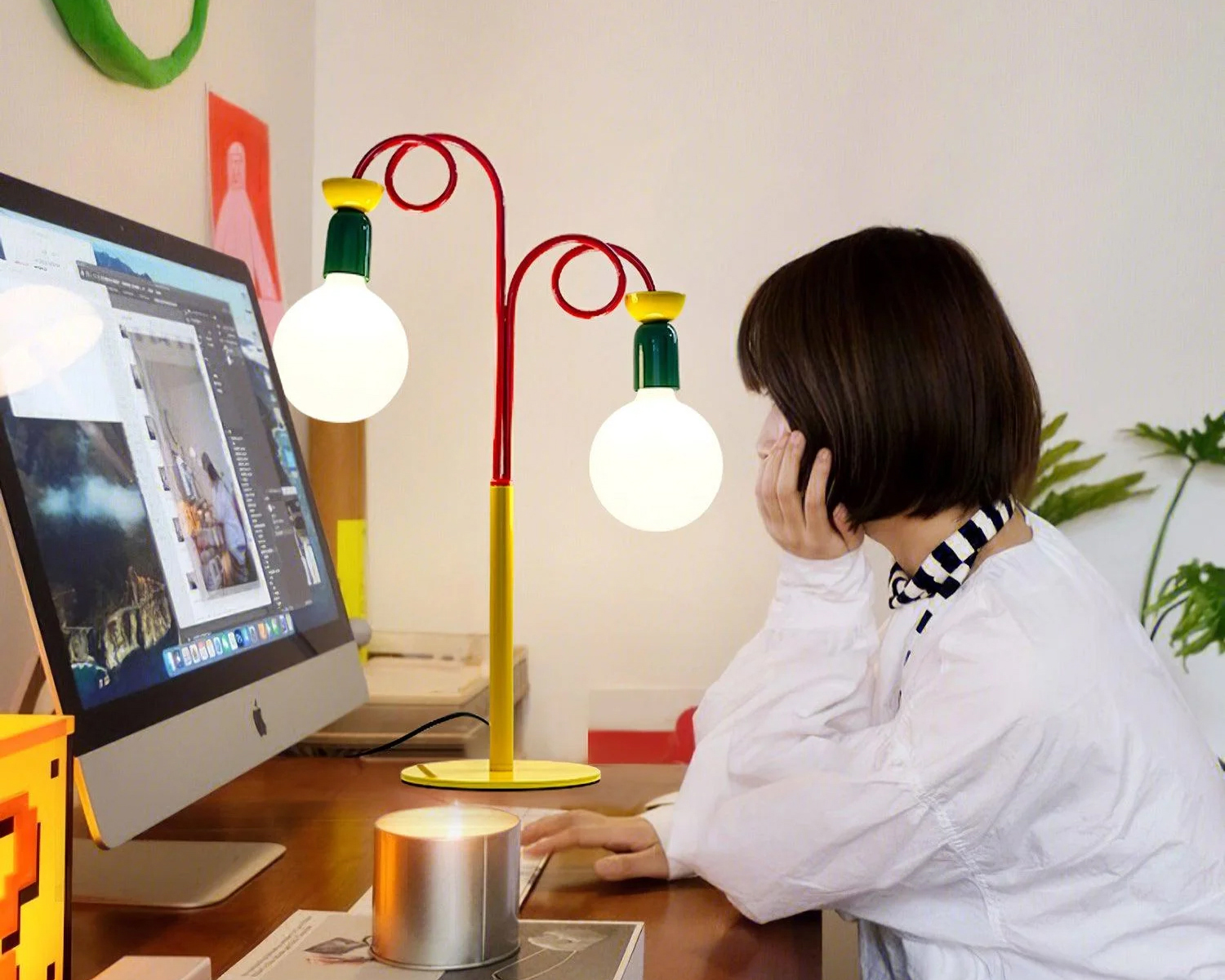 The Circulo Play Table Lamp beautifully blends retro charm with modern flair, taking inspiration from the bold, playful aesthetics of 1980s Memphis design. Its standout geometric form and bold red concentric rings capture attention, while green and yellow accents bring added energy and dimension. Topped with a rounded bulb, the lamp offers generous lighting and a distinctive visual presence. Perfect for those looking to infuse their space with personality, the Circulo Play Table Lamp is a stylish statement of creative expression.