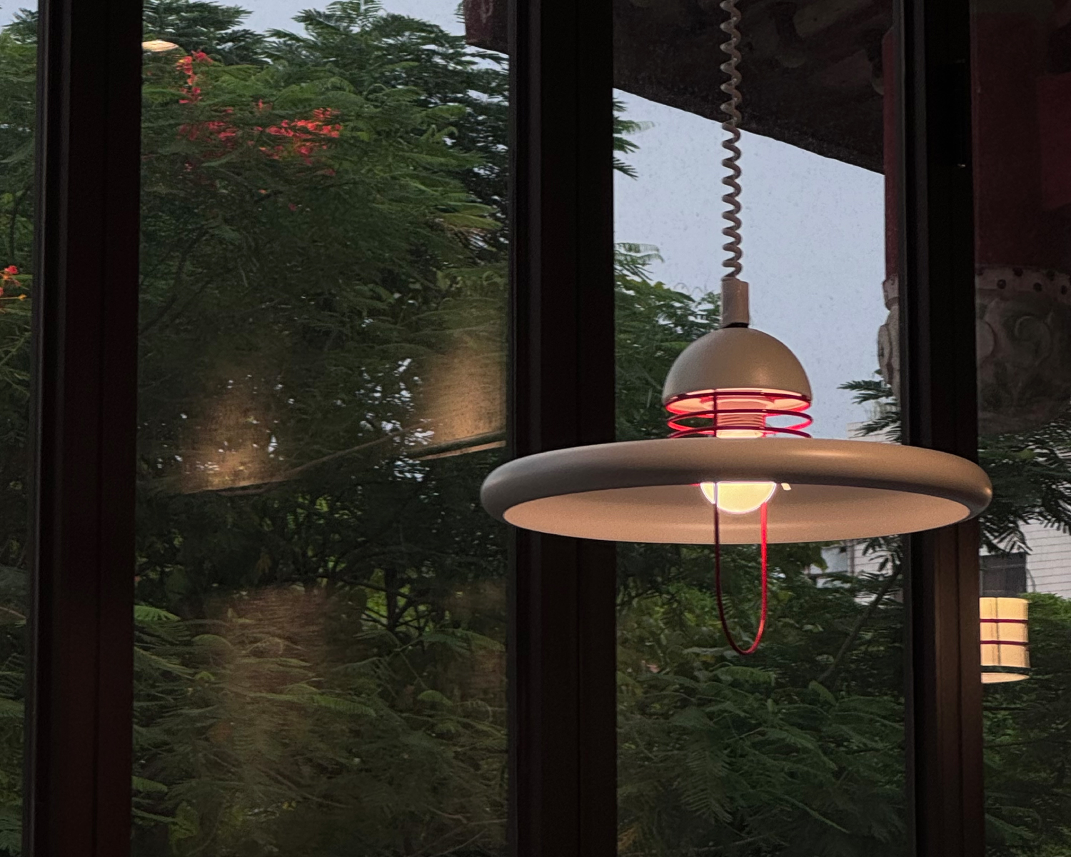 The wide circular shade softly diffuses light downward, creating a warm and comfortable glow while the crimson metal detail introduces a lively design touch. Balanced between minimalism and character, the piece brings a sense of movement and personality to the space.