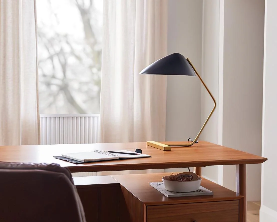 Featuring a shell-shaped metal shade and a light, sculptural T-shaped base, the Curvilinear Table Lamp offers a modern interpretation of classic mid-century design. The adjustable head allows you to direct light exactly where it's needed, making it an ideal choice for reading corners, workspaces, or bedside tables. Stylish and functional, it's a timeless addition to any contemporary interior.