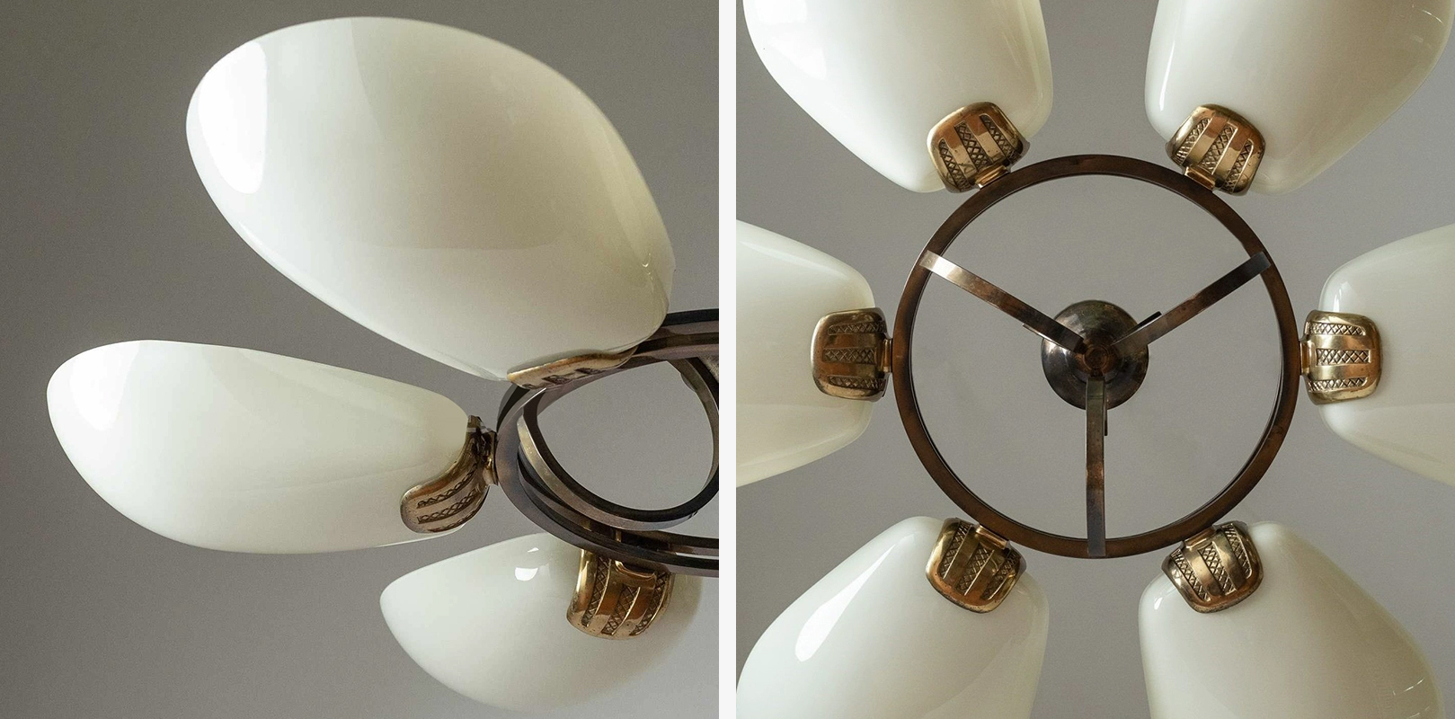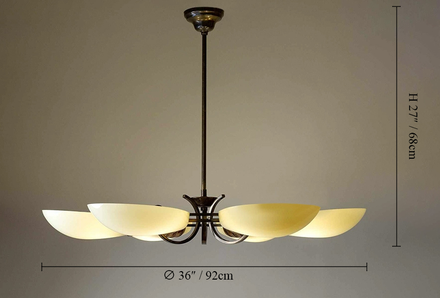 The Deco Petal Chandelier is an authentic statement piece inspired by 1930s German Art Deco design. Crafted with a circular brass frame and cast-brass fittings, it features six ivory glass shades arranged like unfolding petals. Each element reflects timeless elegance and refined craftsmanship.