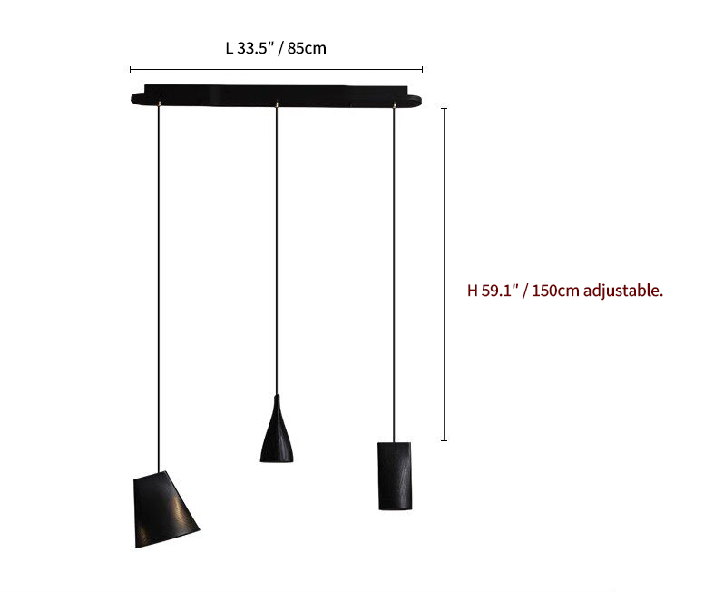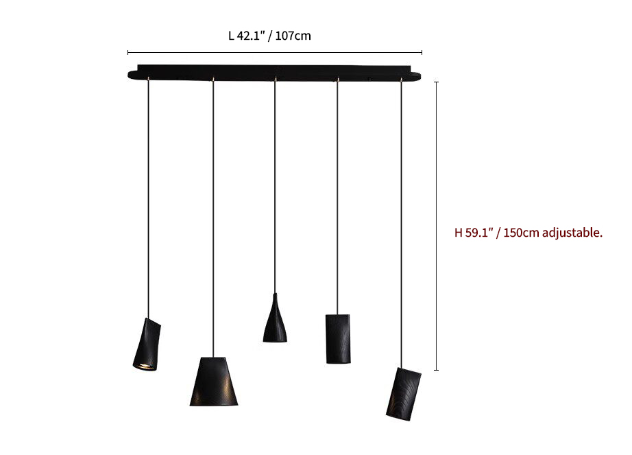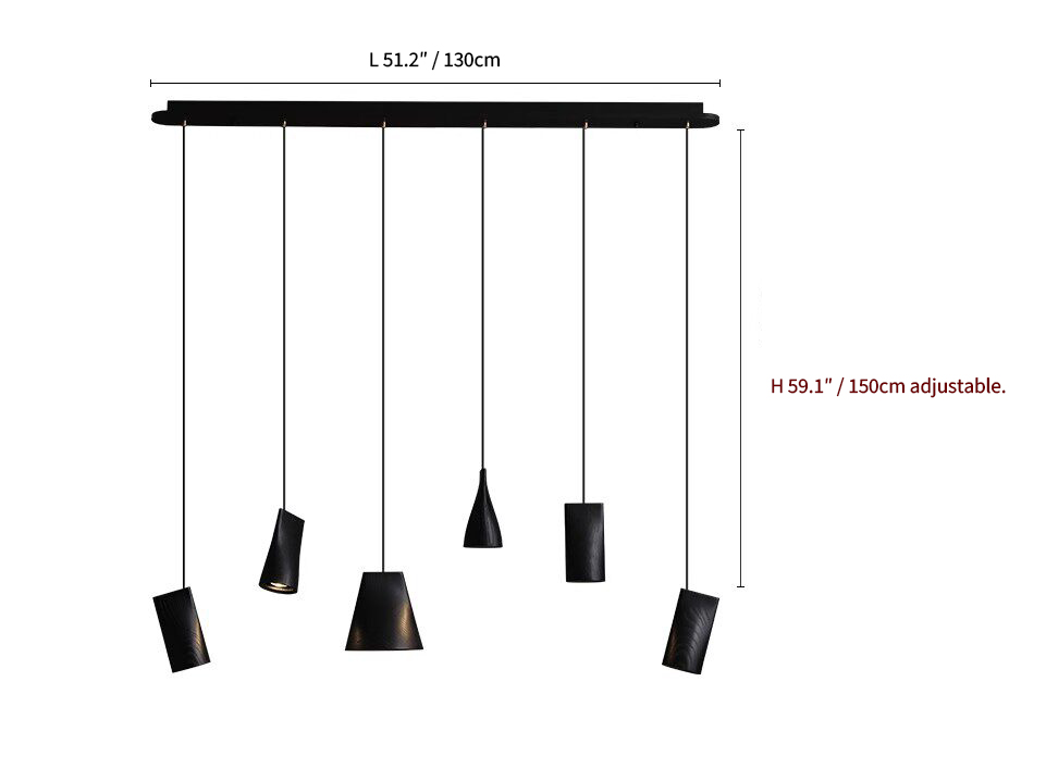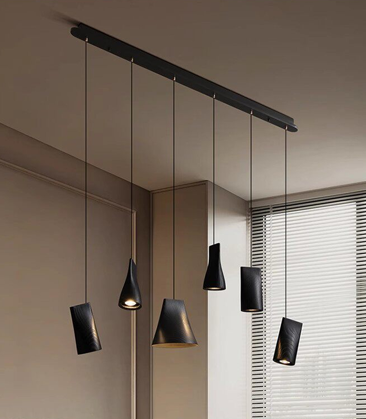 Designed as both a single pendant and a modular composition, the collection allows multiple forms to be arranged together, bringing rhythm and depth to kitchens, dining areas, or long tables. The contrast between the dark wood surface and the soft interior light highlights the material’s natural character while maintaining a clean, contemporary presence.