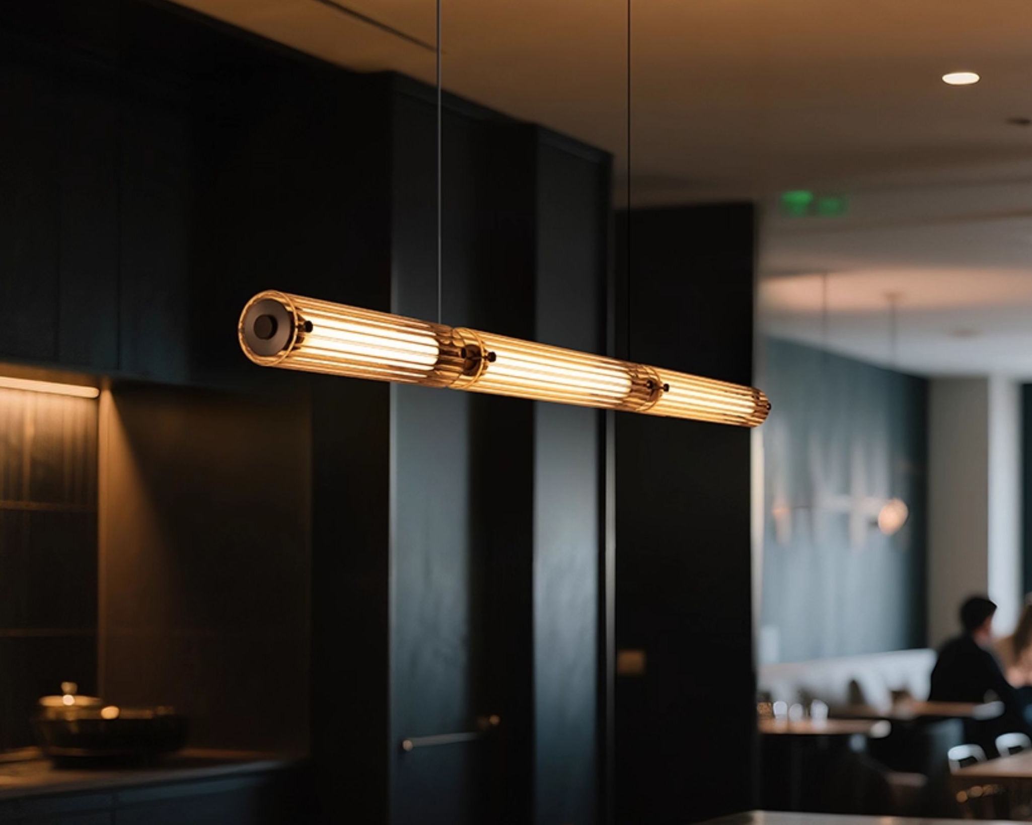 The Glint Wave Linear Pendant Light showcases a harmonious blend of ribbed glass, precise metal detailing, and a softly diffused glow. Each glass segment is shaped through high-temperature craftsmanship, forming orderly light waves that create a comfortable visual experience while adding depth to the space. The linear metal framework features clean, refined connections that complement modern, Italian-inspired, and understated luxury interiors. Made with aviation-grade aluminum alloy, the fixture remains lightweight yet durable, suitable for kitchen islands, dining areas, home offices, and commercial environments. Glint Wave brings a calm, architectural presence to any room.