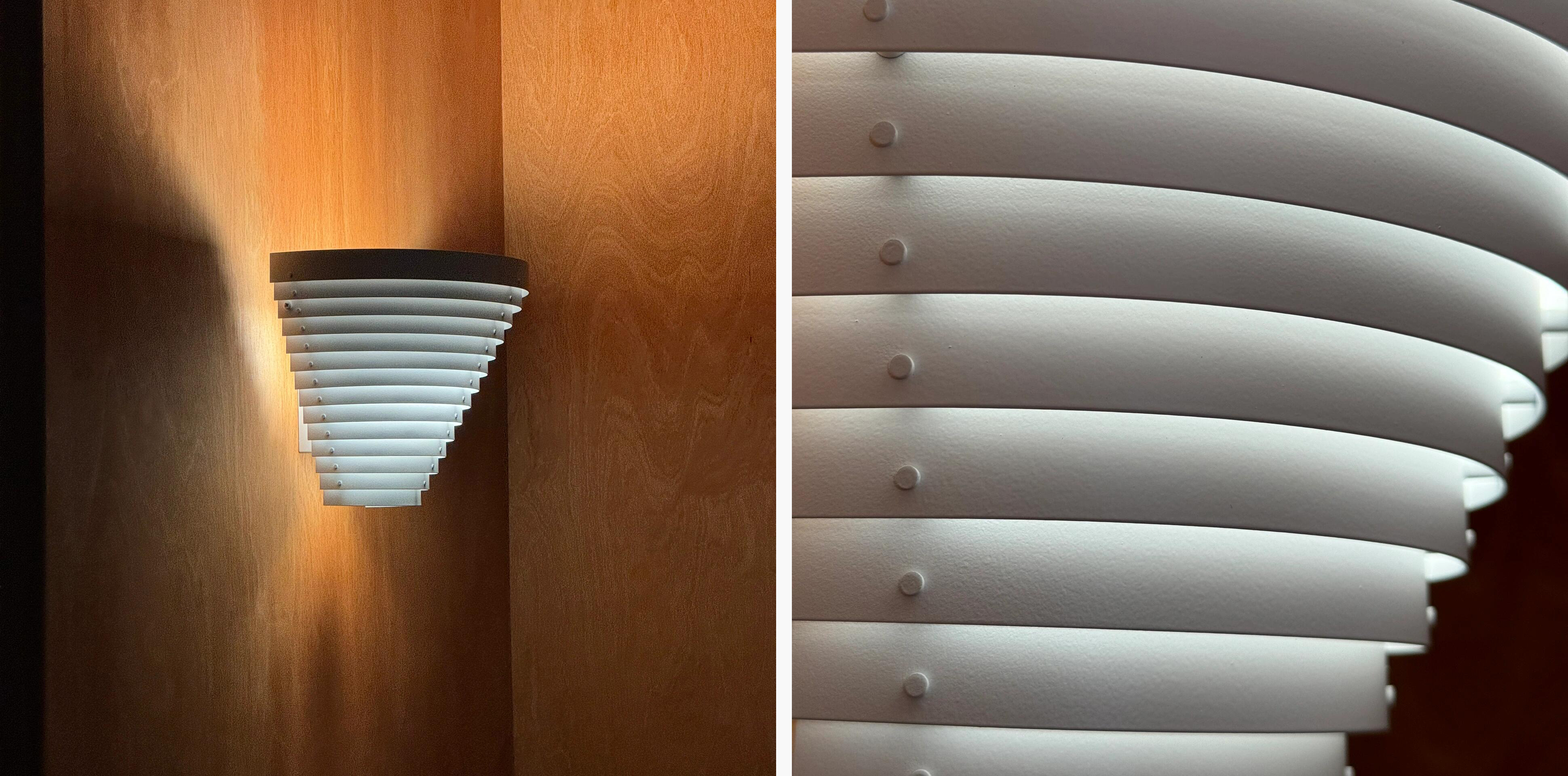 Crafted from durable steel with a smooth white lacquer finish, it softens light through its layered structure, creating a tranquil play of light and shadow on the wall.
