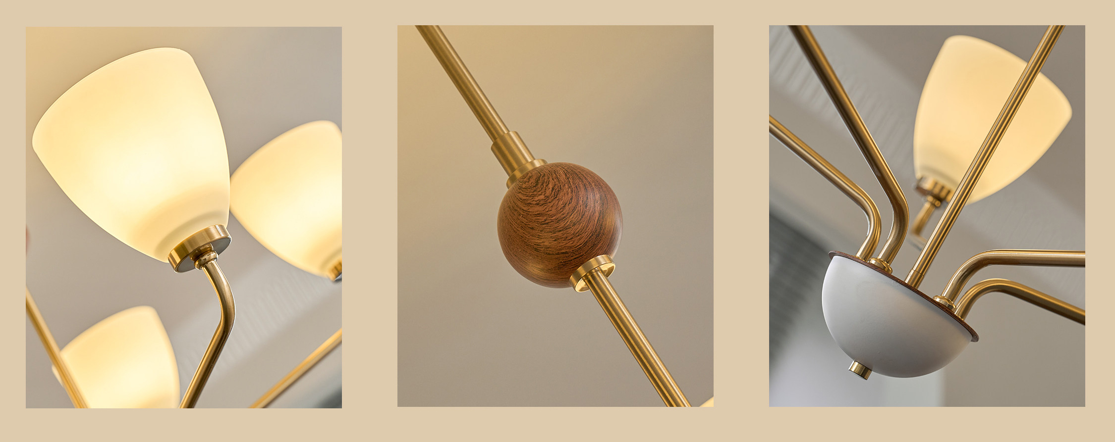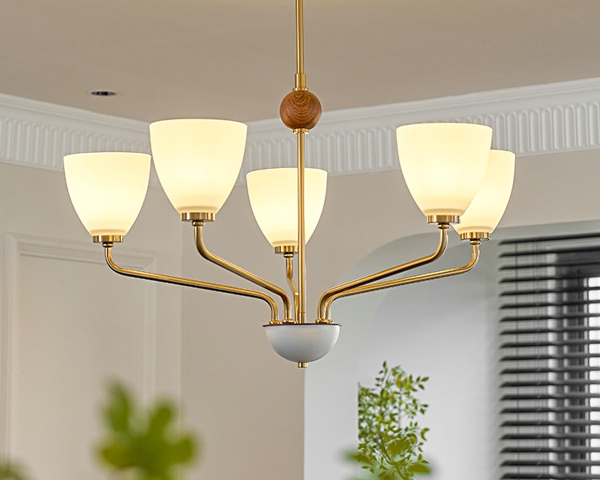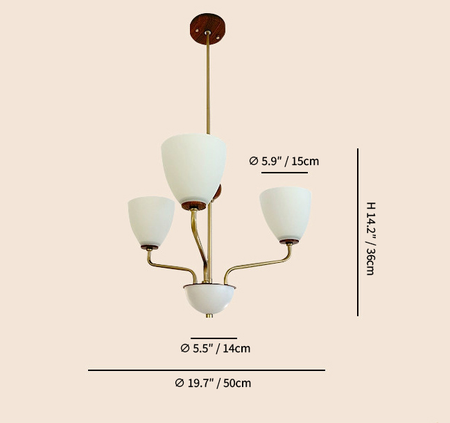 The Hearth Branch Chandelier features a graceful branching structure with three softly curved glass shades, echoing the quiet elegance of a modern candelabra. Warm metal tones and natural wood accents introduce a subtle Nordic character, creating a calm and inviting presence.