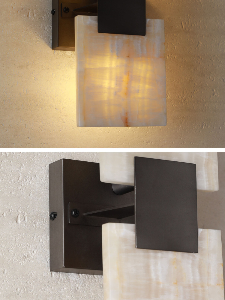 Crafted with translucent onyx panels, it gently diffuses light upward and downward, creating a warm, ambient glow while highlighting the stone’s natural veining.