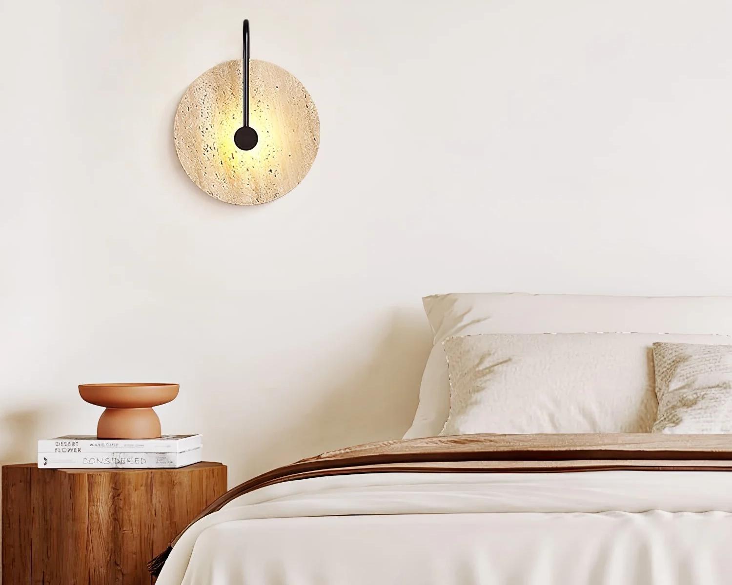 Experience the quiet elegance of the Luminous Horizon Sconce, a sculptural wall light that fuses nature’s artistry with modern design. Crafted from genuine travertine stone, each piece reveals unique veins and pores that softly diffuse the light, creating a gentle, ambient glow. The slender black metal arm pierces through the circular stone, striking a harmonious balance between strength and subtlety. Evoking the warmth of the setting sun, this piece transforms any interior into a serene, refined retreat—where organic texture meets contemporary sophistication.