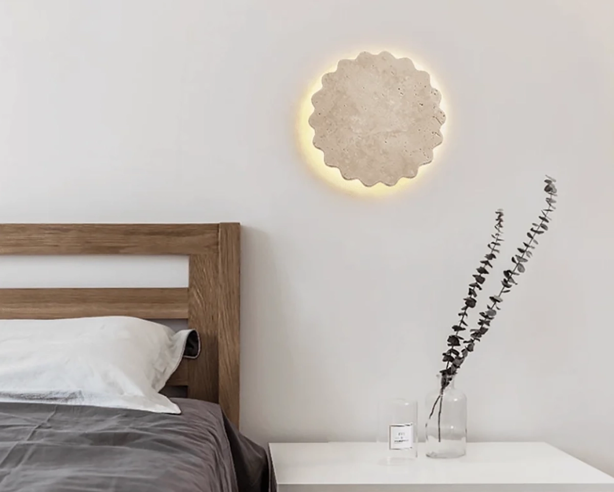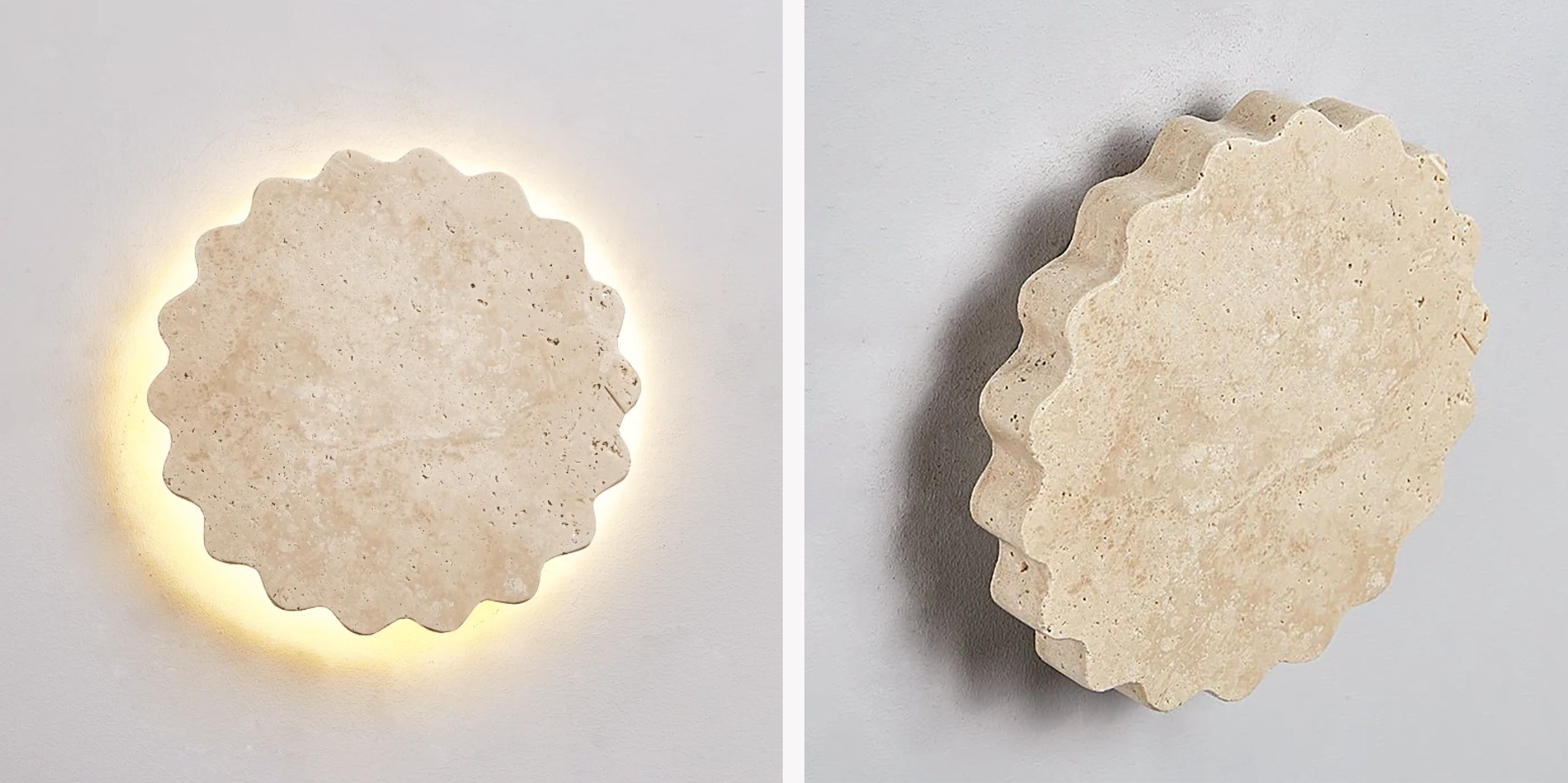 Handcrafted from natural travertine, the Luna Scallop Wall Lamp embodies the quiet beauty of organic form and material. Its softly contoured, scalloped edges lend a sense of movement and warmth, while the gentle backlight highlights the stone’s natural grain and texture. Radiating a calm, sculptural presence, this wall lamp complements modern and minimalist interiors alike—perfect as an ambient accent in living rooms, bedrooms, or hallways.