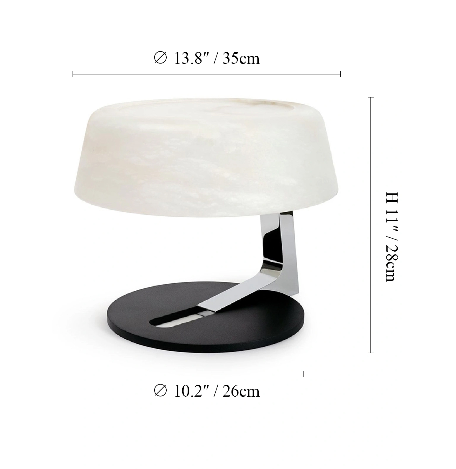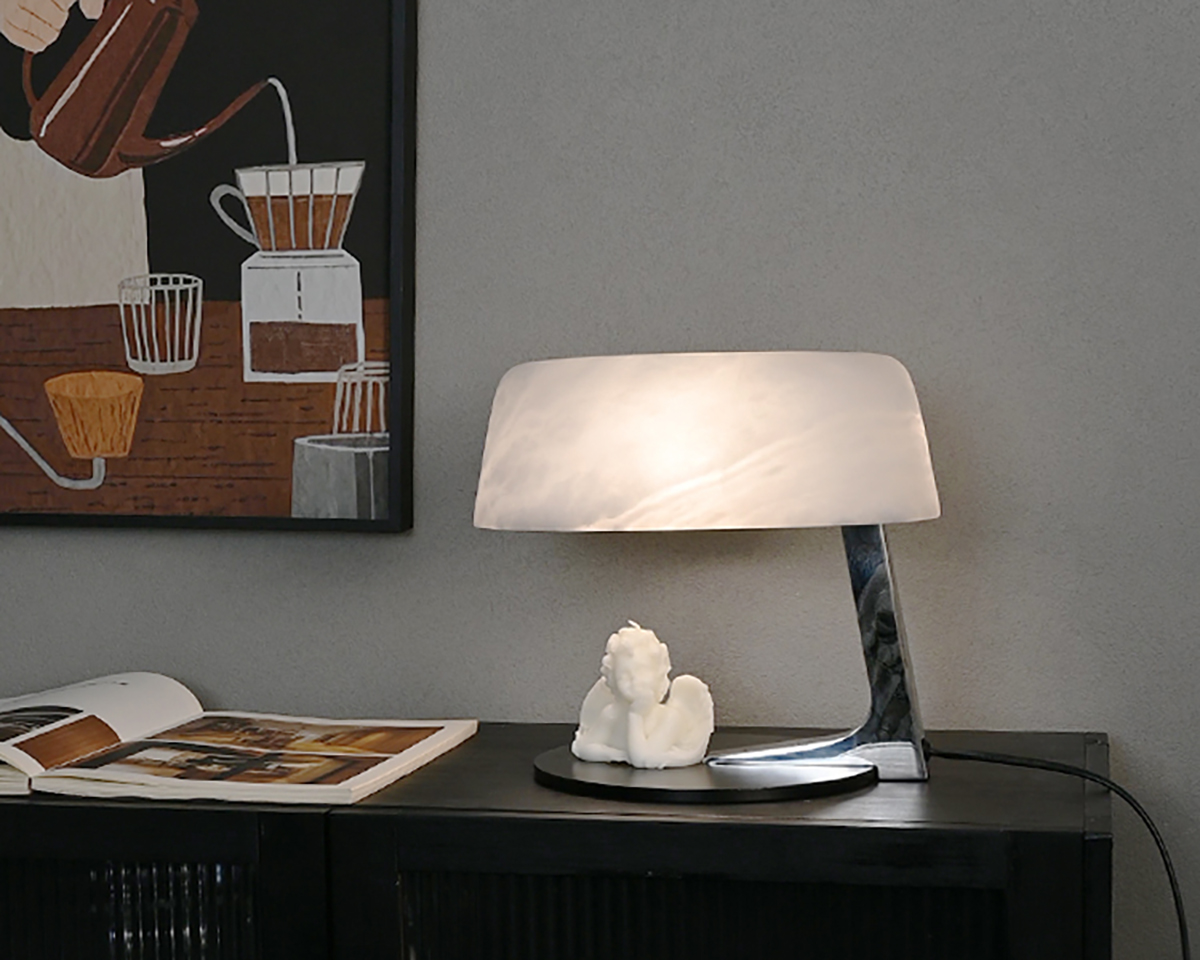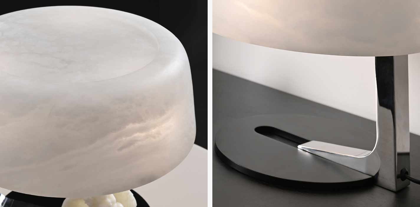 Inspired by the calm glow of the moon, the Lunara Stone Table Lamp combines natural artistry and modern craftsmanship. Each shade is hand-cut from Spanish alabaster, revealing unique patterns of soft, milky light. The heavy iron base grounds its form, while the chrome-finished arm reflects a quiet sophistication — perfect for spaces that value warmth, balance, and timeless design.
