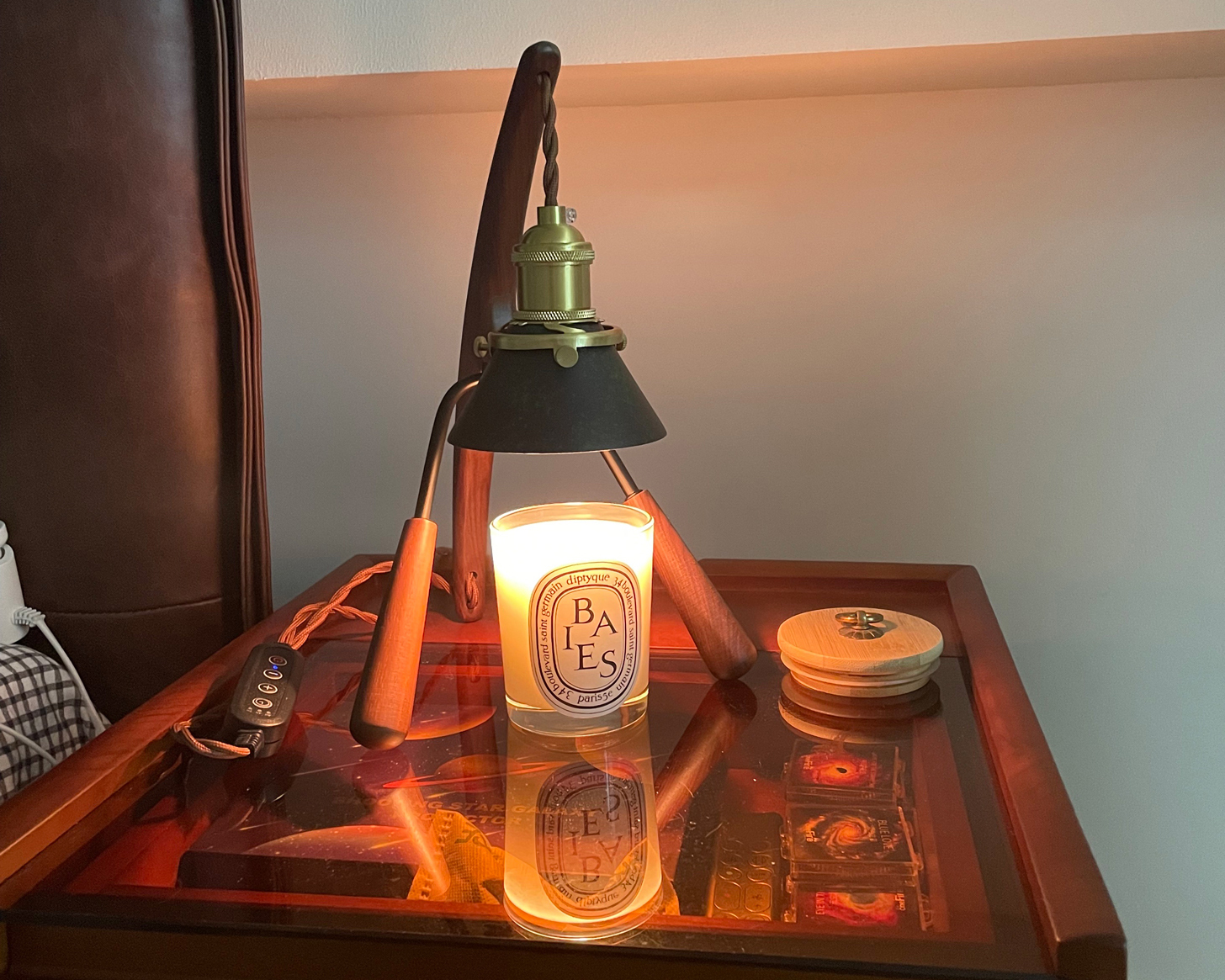 Crafted from solid walnut wood and brass, the Mantis Wax Warmer Lamp embodies a perfect balance of artistry and function.