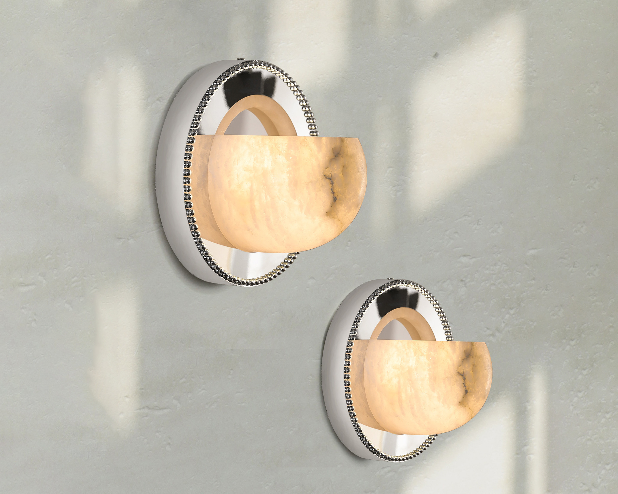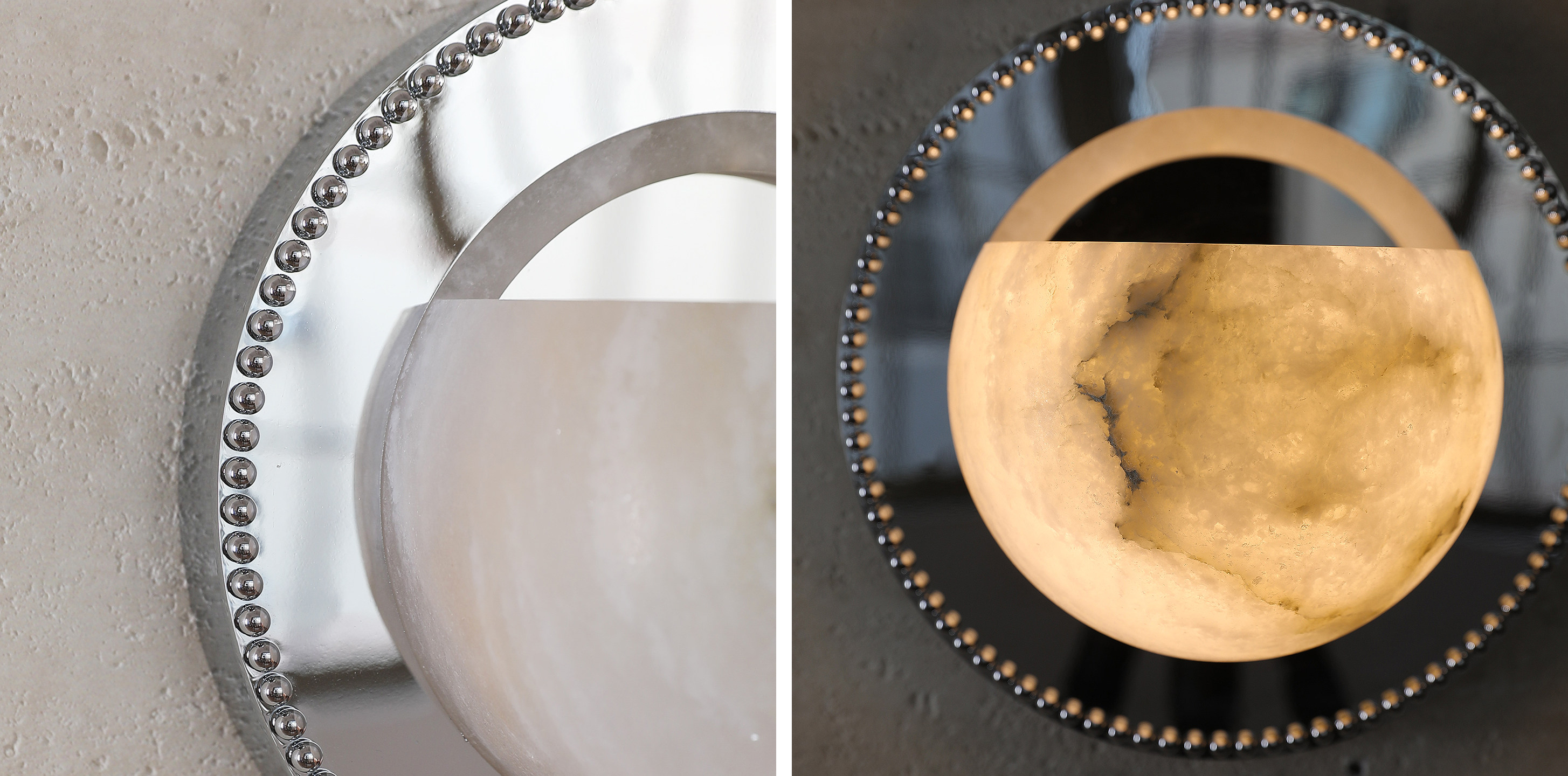 Hand-carved alabaster meets mirror-polished stainless steel in a study of contrast.