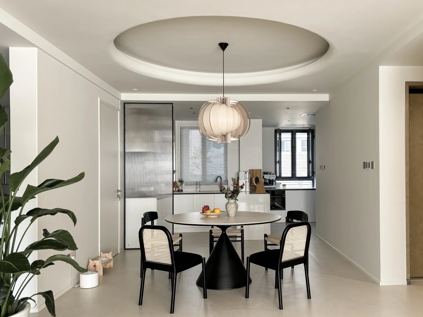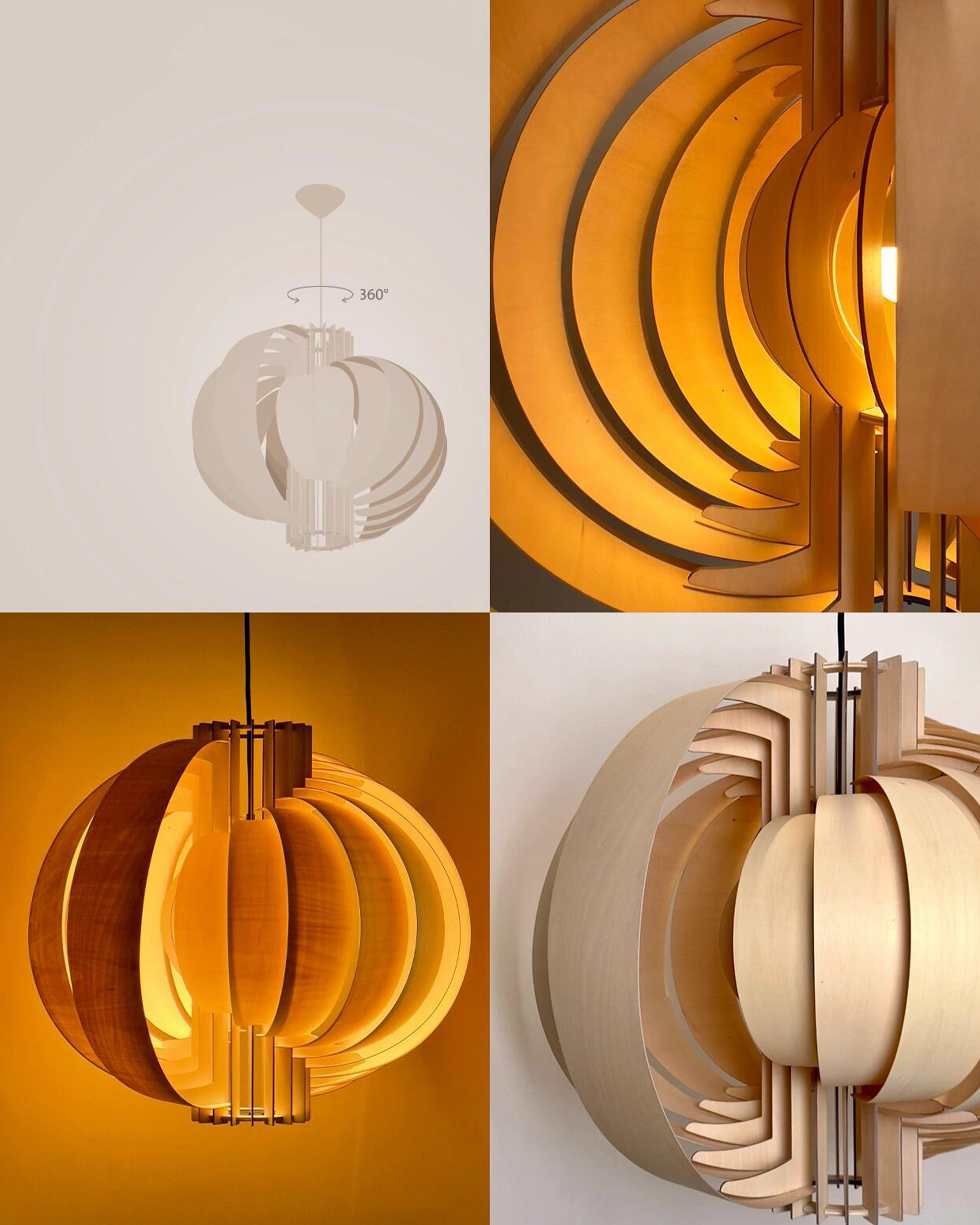 This lamp features slats with a basswood finish arranged into a moon-like structure. The wood’s natural color and the composition of the slats create an organic and earthy appearance. Additionally, the light filtering through the slats produces a gentle diffusion, emitting a warm, soft glow that is ideal for creating a comforting indoor atmosphere.