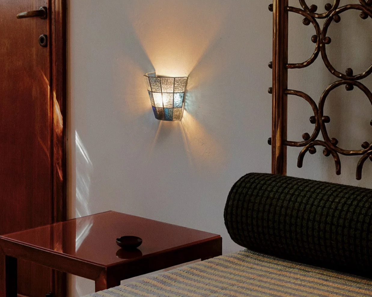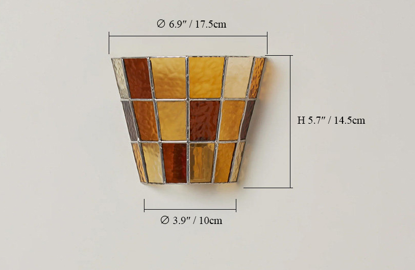 Defined by its clean, upright form, the Mosaic Drift Wall Sconce shows the beauty of hand-assembled textured glass in a direct way. The mosaic shade is made of individually cut glass panels. Each panel has soft ripples and small color changes, so the light feels gentle and the surface gains quiet depth.