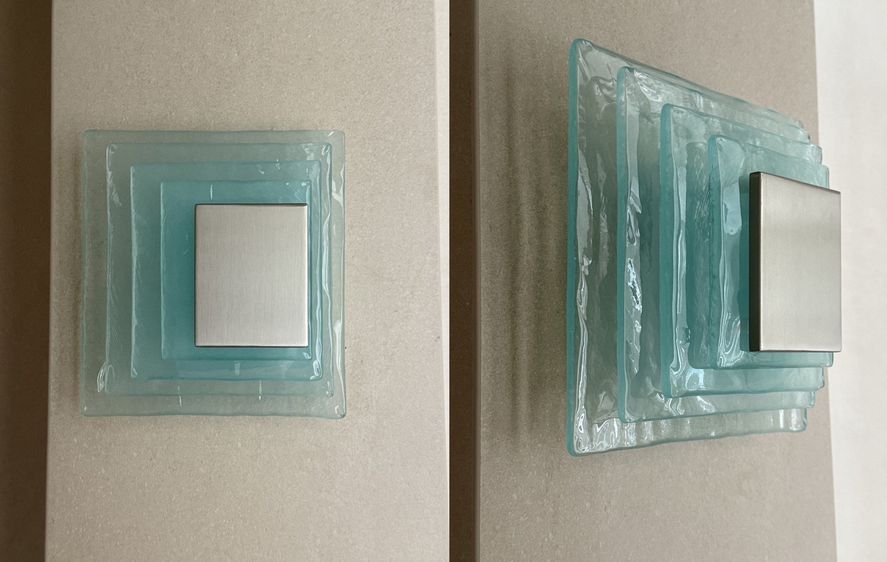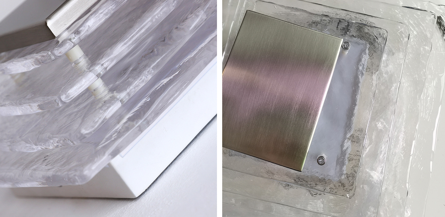 The layered glass forms a floating glacier; as warm light filters through, it turns into a pale blue flame, softening its glow into a quiet cascade of luminosity.